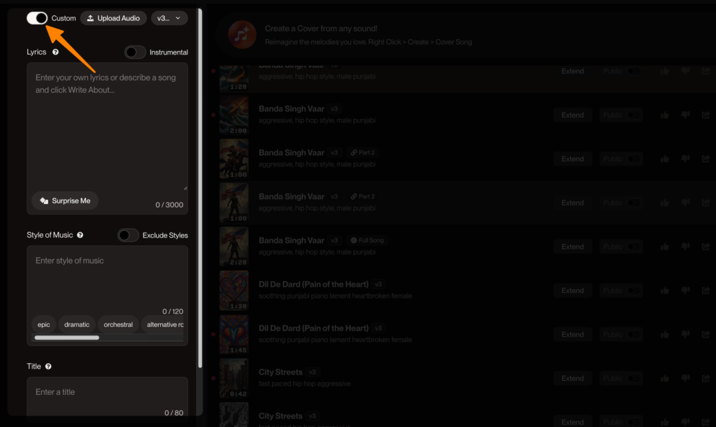 - Cover Song: You can also create cover of any generated song with your own voice and it aligns perfectly with the Suno music generator.