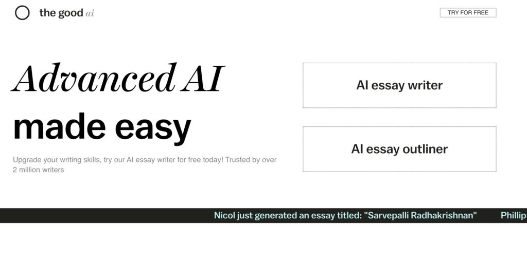 With features like essay generator, AI writing tool, and the ability to create high-quality essays tailored to specific requirements, The Good AI embodies the progression of AI technology in education, addressing a broad spectrum of writing needs including academic writing, content creation, and more, making it a notable contender in the realm of AI essay writing tools.