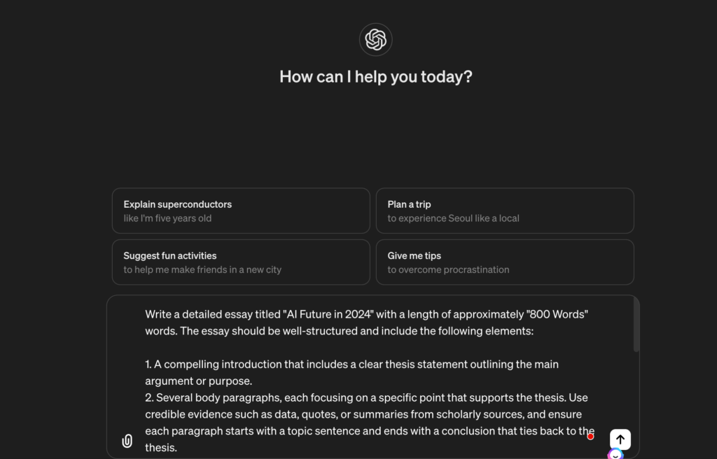 ChatGPT stands out in the landscape of AI writing tools for its advanced capabilities in generating coherent, well-structured essays that mimic human writing styles. This AI essay writer leverages generative AI technology to produce content that is not only original but also tailored to specific requirements, including essay length, format, and subject matter. With features like understanding context, refining arguments, and suggesting improvements, ChatGPT can be an invaluable asset for students, academics, and content creators aiming for high-quality essays. Here’s a step-by-step guide to utilize ChatGPT for your essay writing needs: