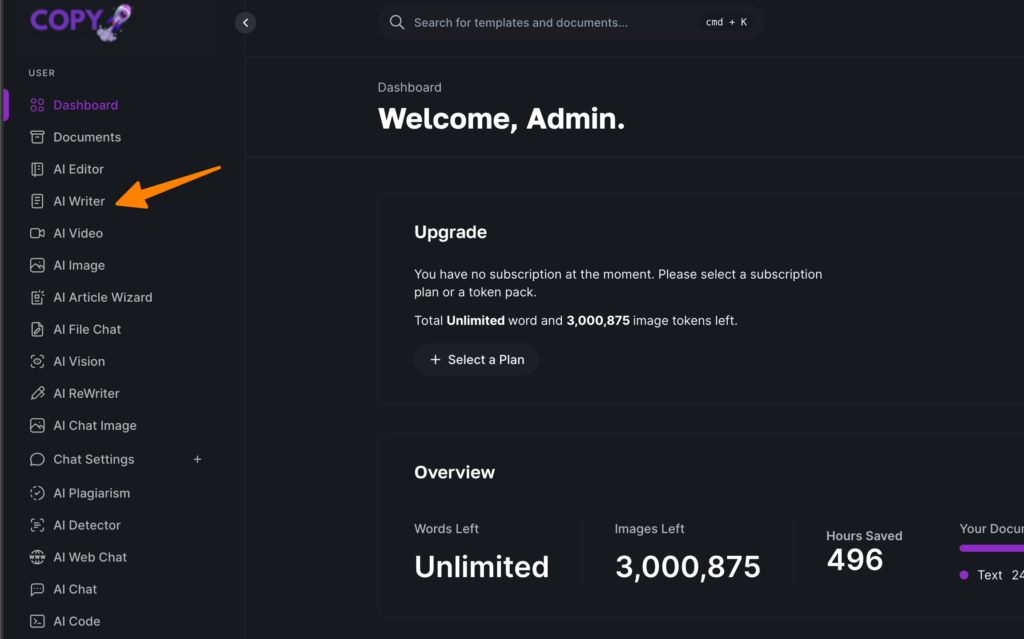 Navigate to the dashboard’s sidebar and click on “AI Writer” to access the writing tools.