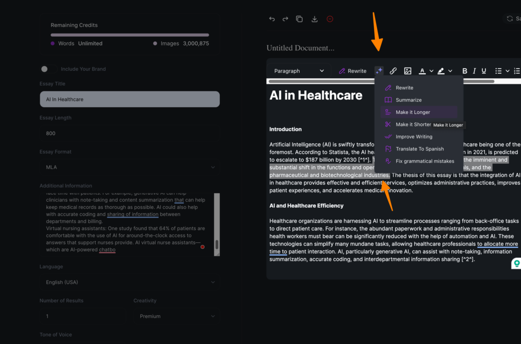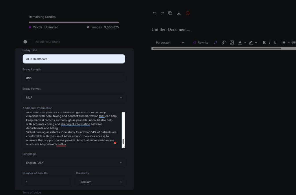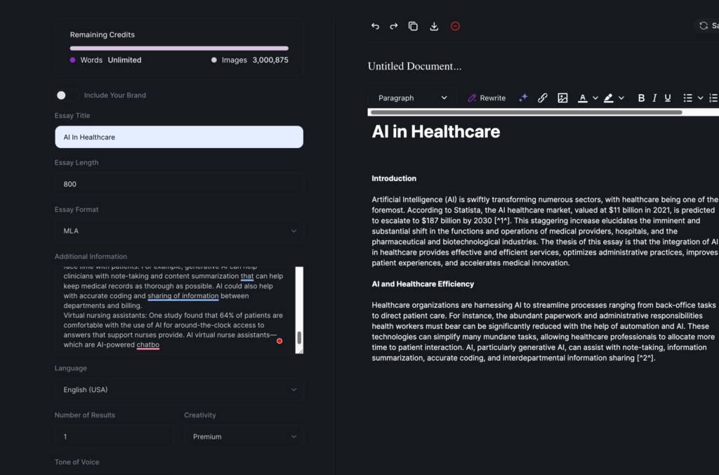 - Customizable Settings (Premium): Allows further personalization of essays by pre-defining parameters like essay type, citation formats, academic level, and tone.