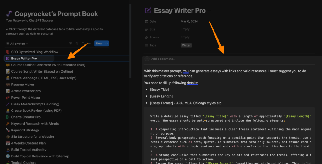 Explore the Prompt Book: Begin by visiting Copyrocket AI’s website and navigating to their Prompt Book, where you’ll find the “Essay Writer Pro” option. This library of prompts is designed to kick-start the essay writing process using AI.
