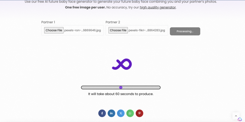 Upload Parent Photos: You will find a form ready for you to upload a photo of the dad and a photo of the mom. This is the crucial step where the AI begins to understand the facial features to combine in the future baby’s image.