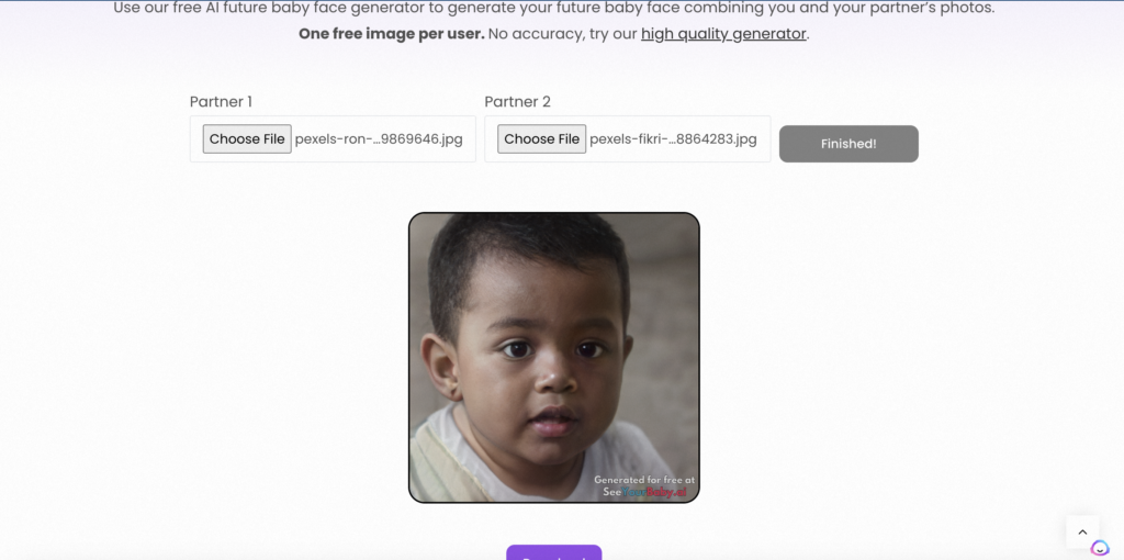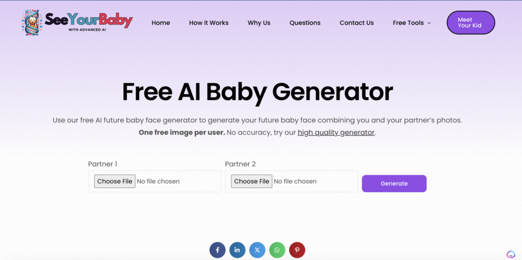 Upload Photos: Upon arrival, you’ll be greeted with a simple form. Here, you’re prompted to upload a photo of the dad and a photo of the mom. The AI tool will analyze these photos to generate an image of your potential baby, leveraging advanced AI algorithms to ensure a realistic image.