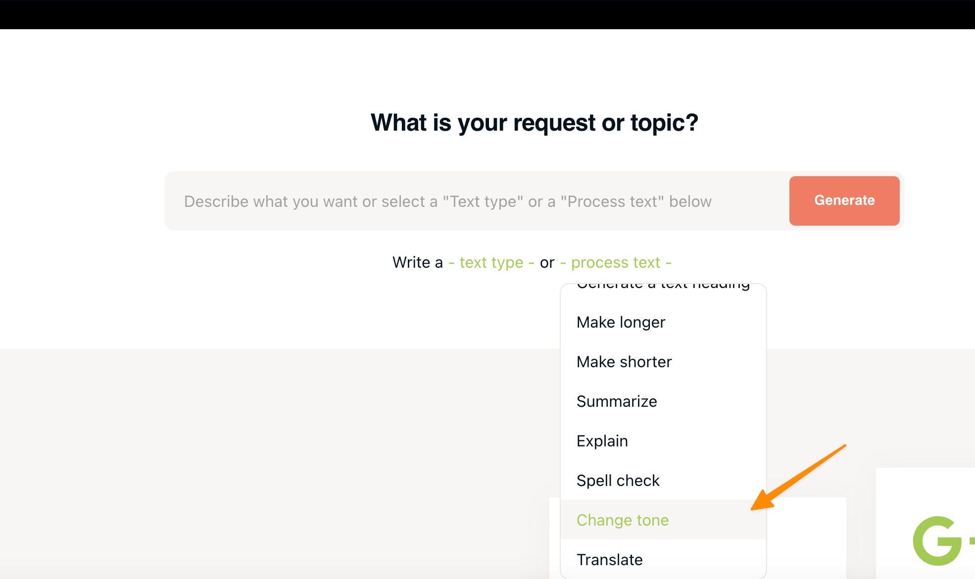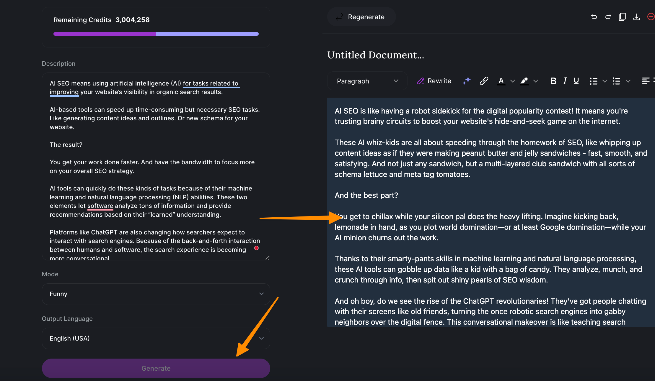 Select your desired language and click on Generate to start paraphrasing content, and you will see paraphrased text on the right side;
