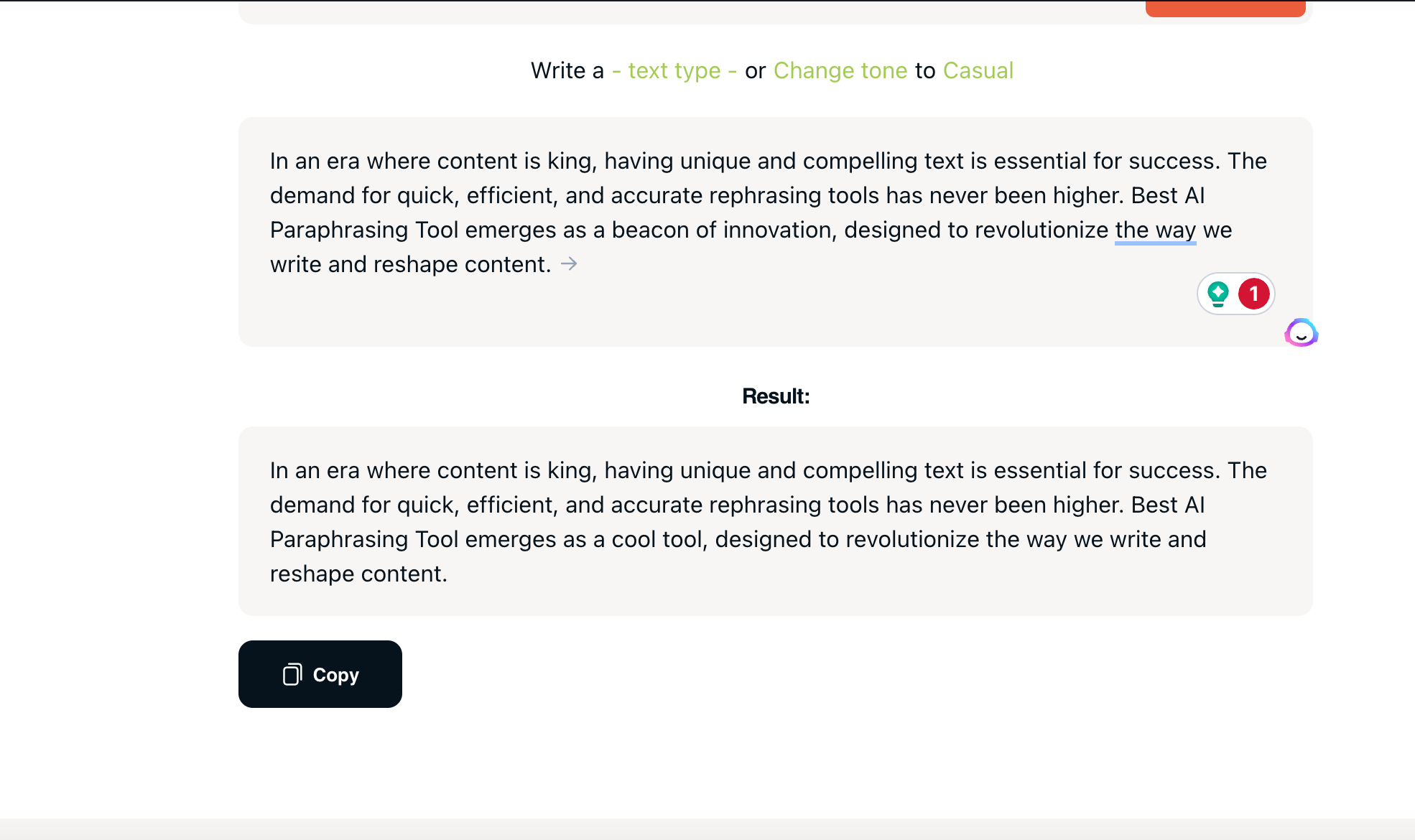 In addition to rewriting content, this tool also offers key features such as a grammar and spelling check feature, ensuring that your text is error-free and easy to comprehend. Say goodbye to time-consuming proofreading tasks with this all-in-one AI-poered tool.