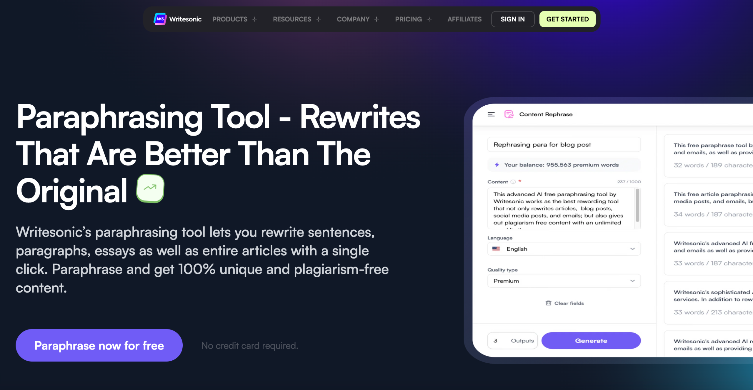 Last but not least, we have Writesonic – an AI writing assistant that offers advanced paraphrasing capabilities. This tool uses GPT-3 technology and can quickly generate human-like text based on your input.