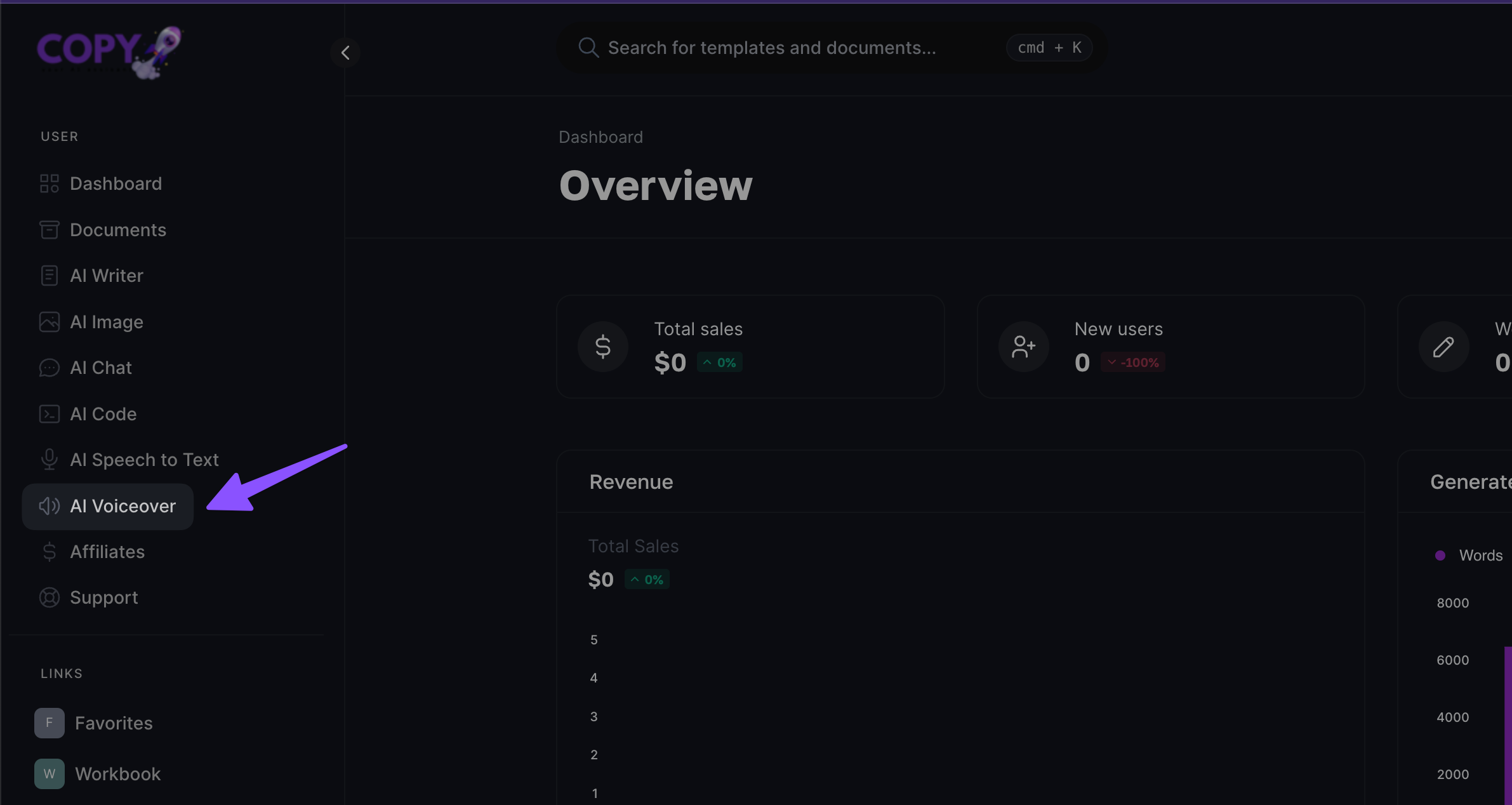 First, you need an account to our portal here, and from the dashboard click on AI Voiceover to use text to speech feature;