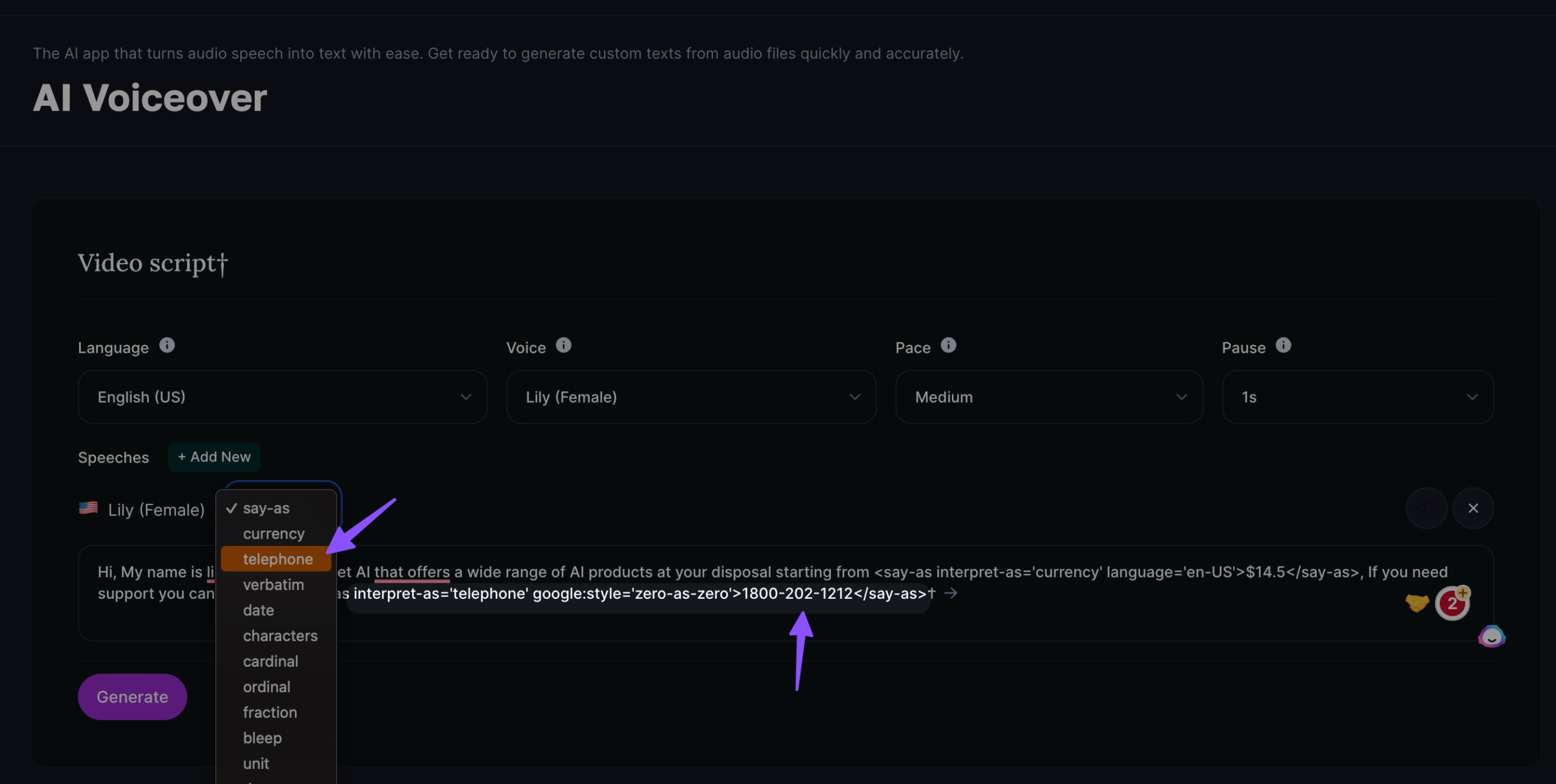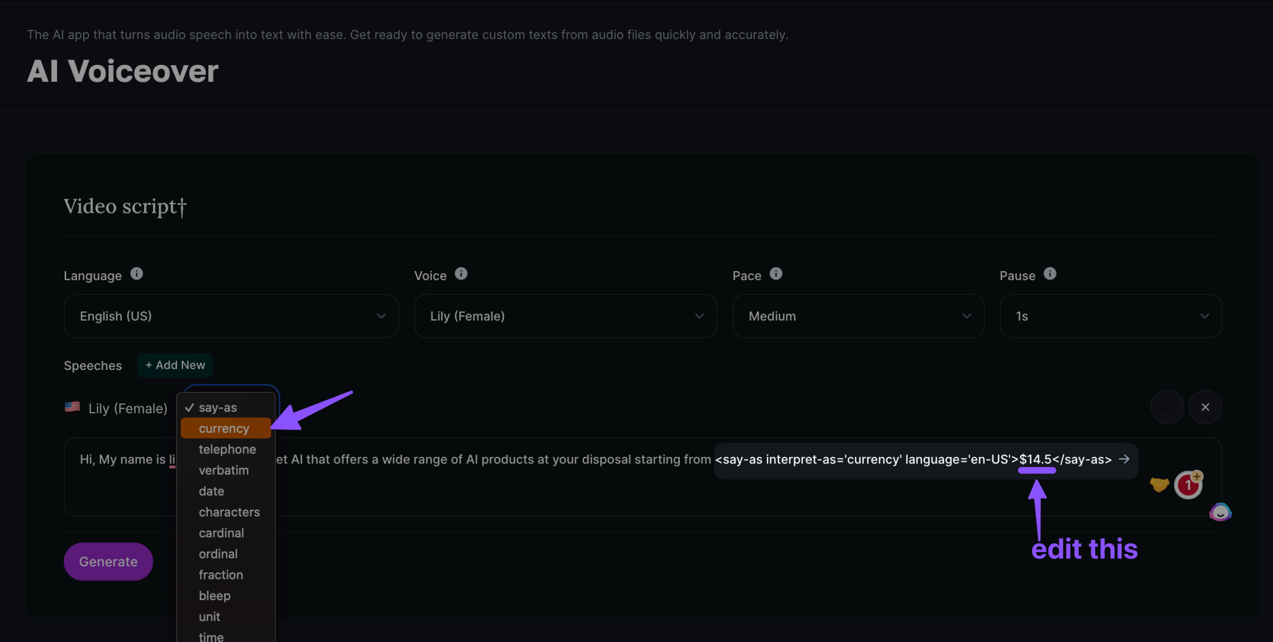 If you want AI voice actors to speak currency in the script then you can choose the currency option below;