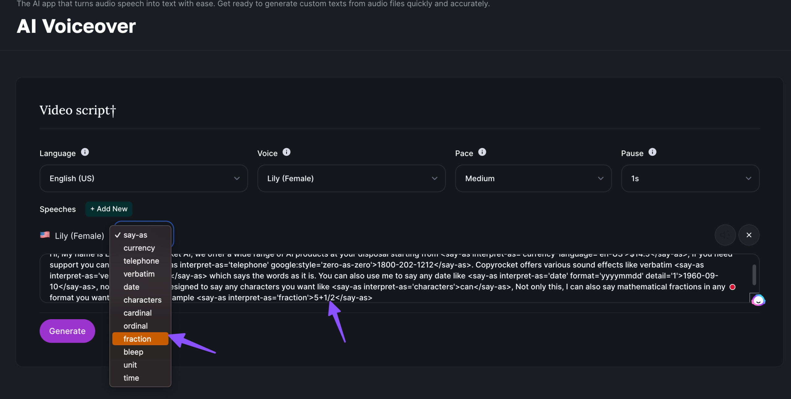 If you want AI voice to say mathematical operators like “fractions” you can easily do it with the help of fractions sound effect as below;