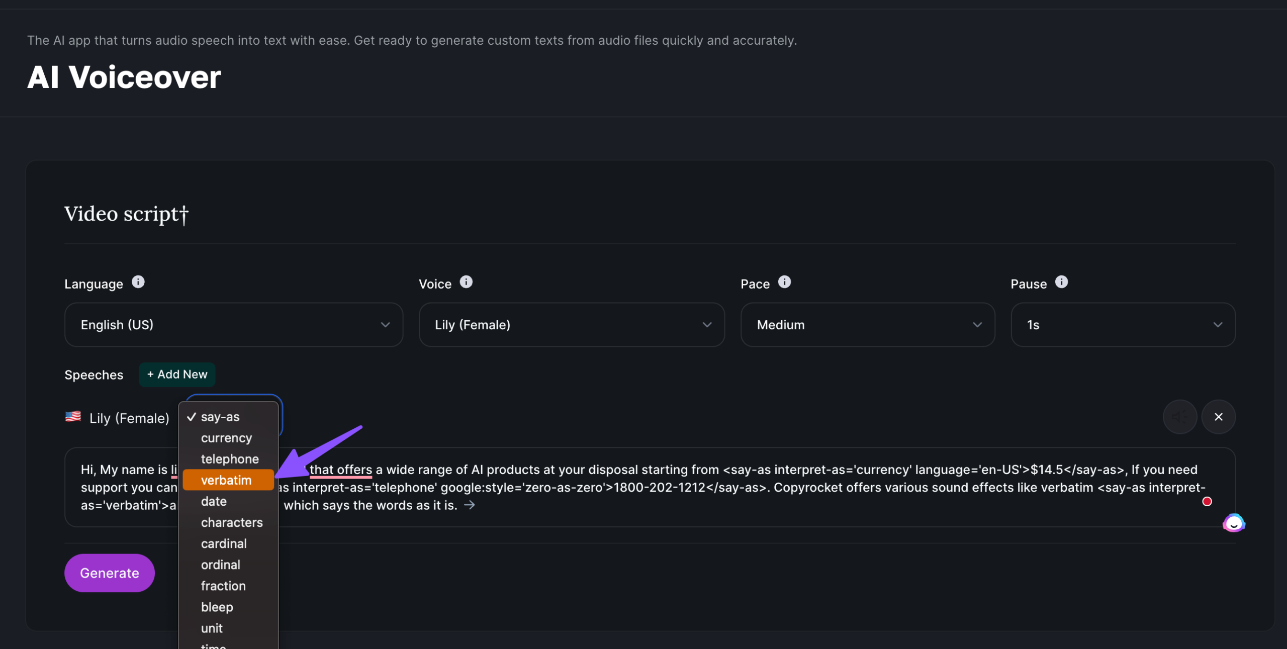 If you want to say a set of characters as it is, like “abcdef”, and you want the AI voice to say each character not pronounce it, then you can use the Verbatim option as below;