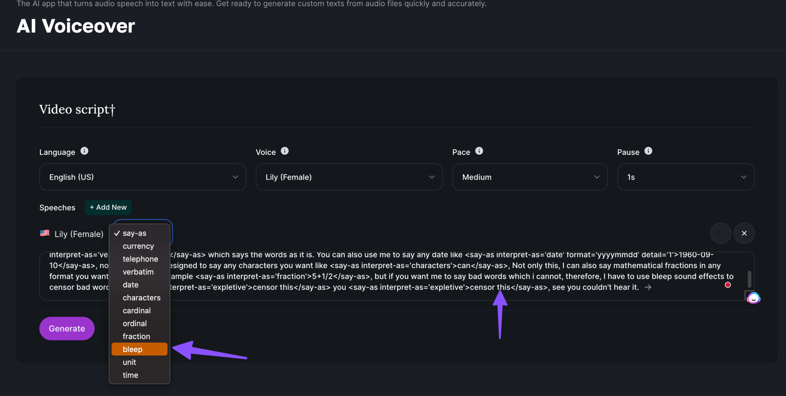 If you want AI Voice to hide or censor some words then you can use a bleep sound effect which in our opinion is the best we got for any AI voice generators as below;