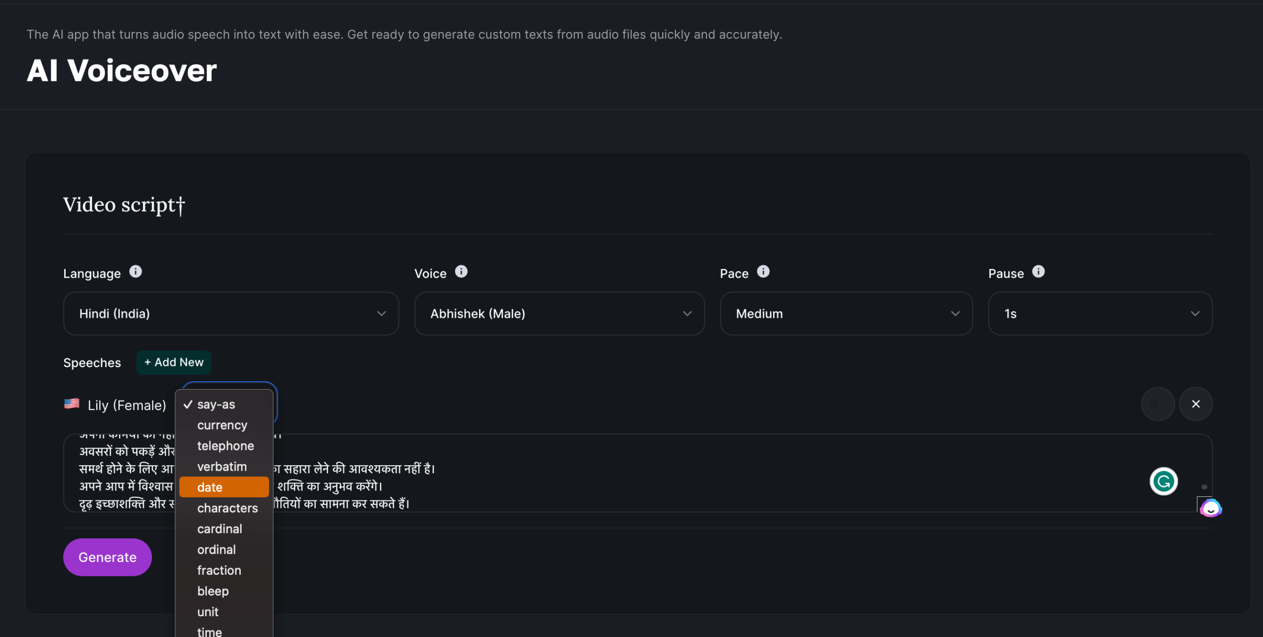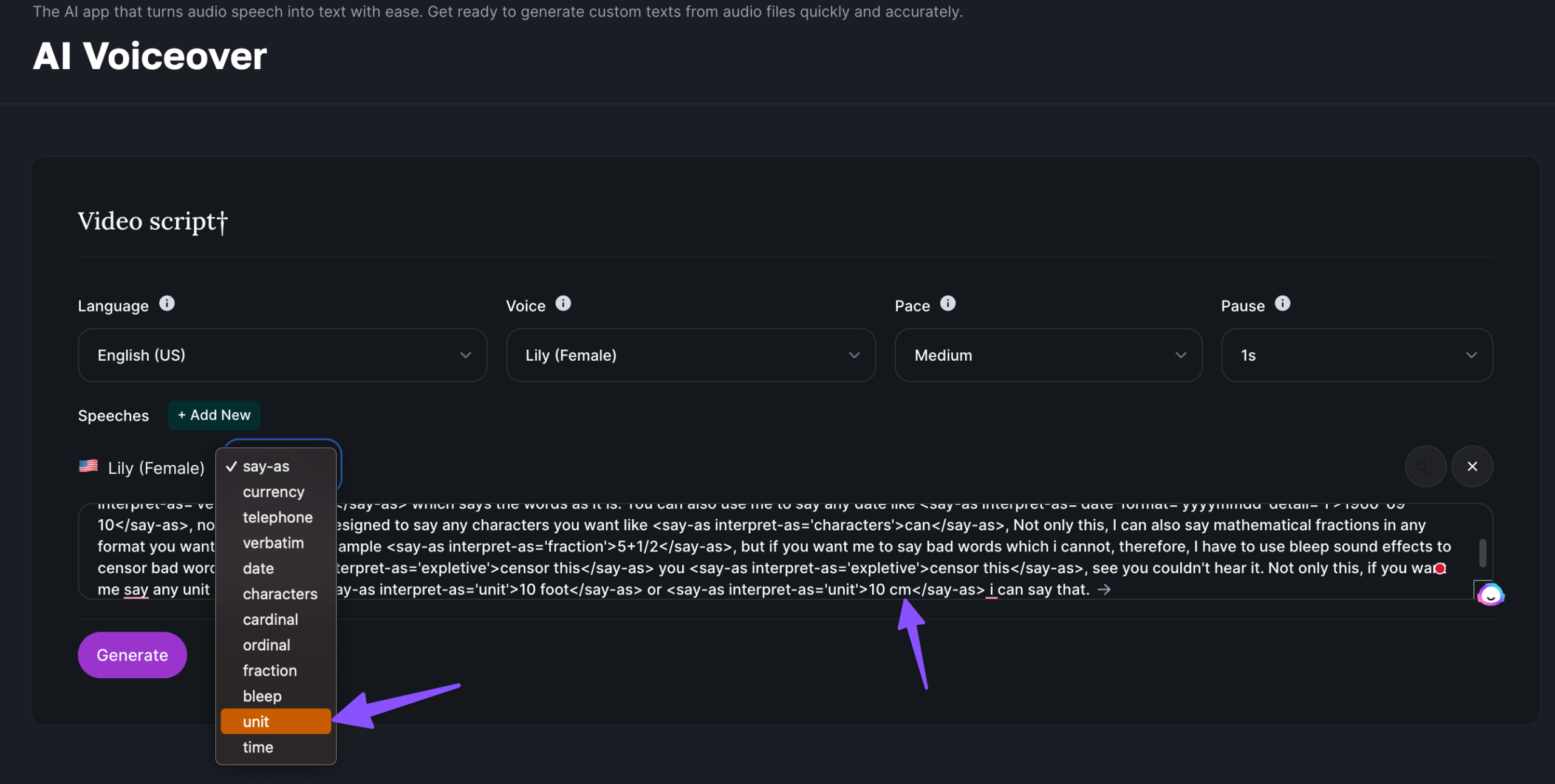 If your script contains units like Cm, Foot, Feet etc you can easily create with our own AI voice platform, just you need to select the Unit option as follows;