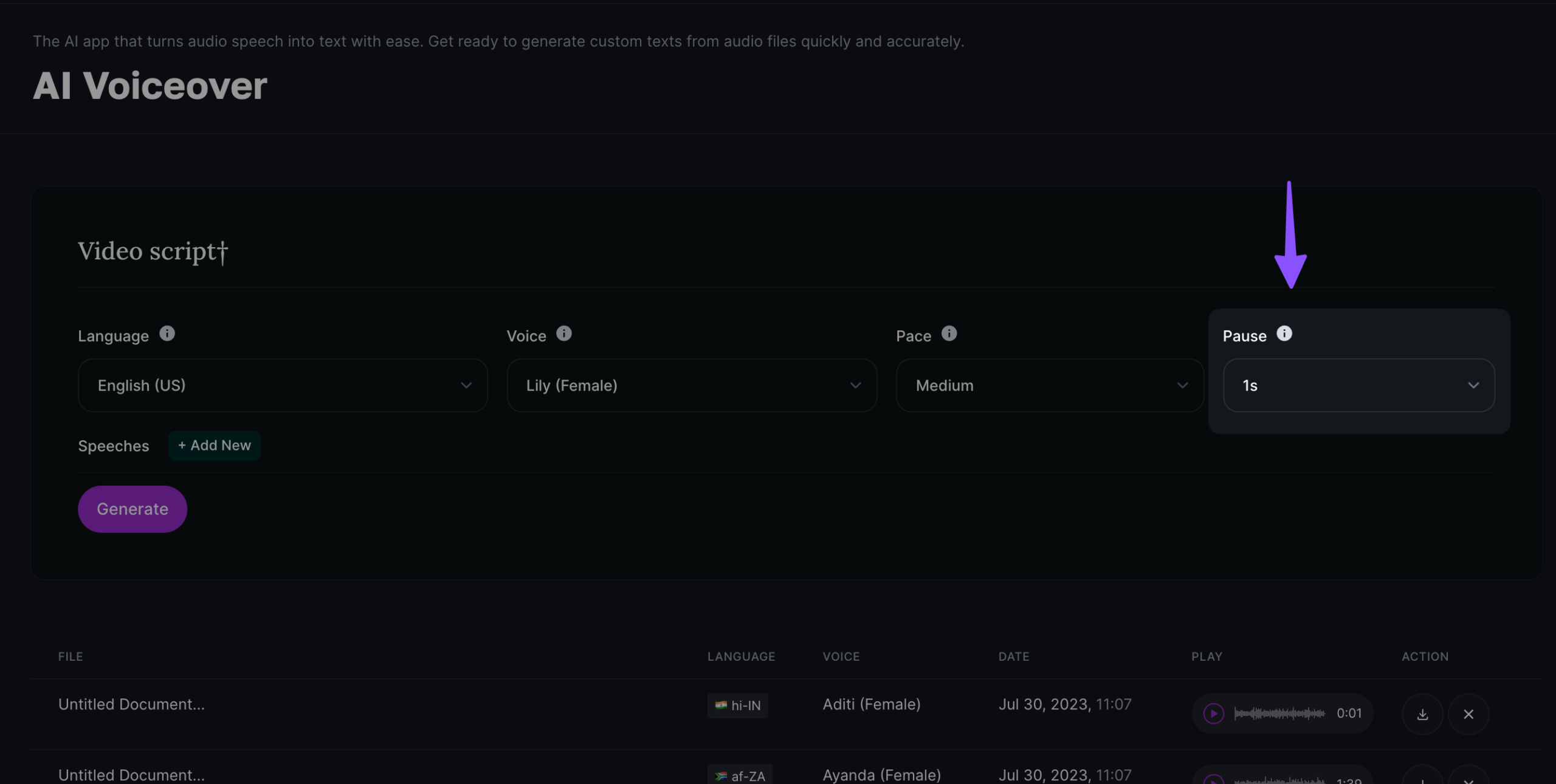 Now before generating voiceovers, we have a few modifiers to choose from, first is the “Pause”, how many pauses you want in between your sentences, in my recommendation, you should select 1s only and you can select up to 4 seconds as below;