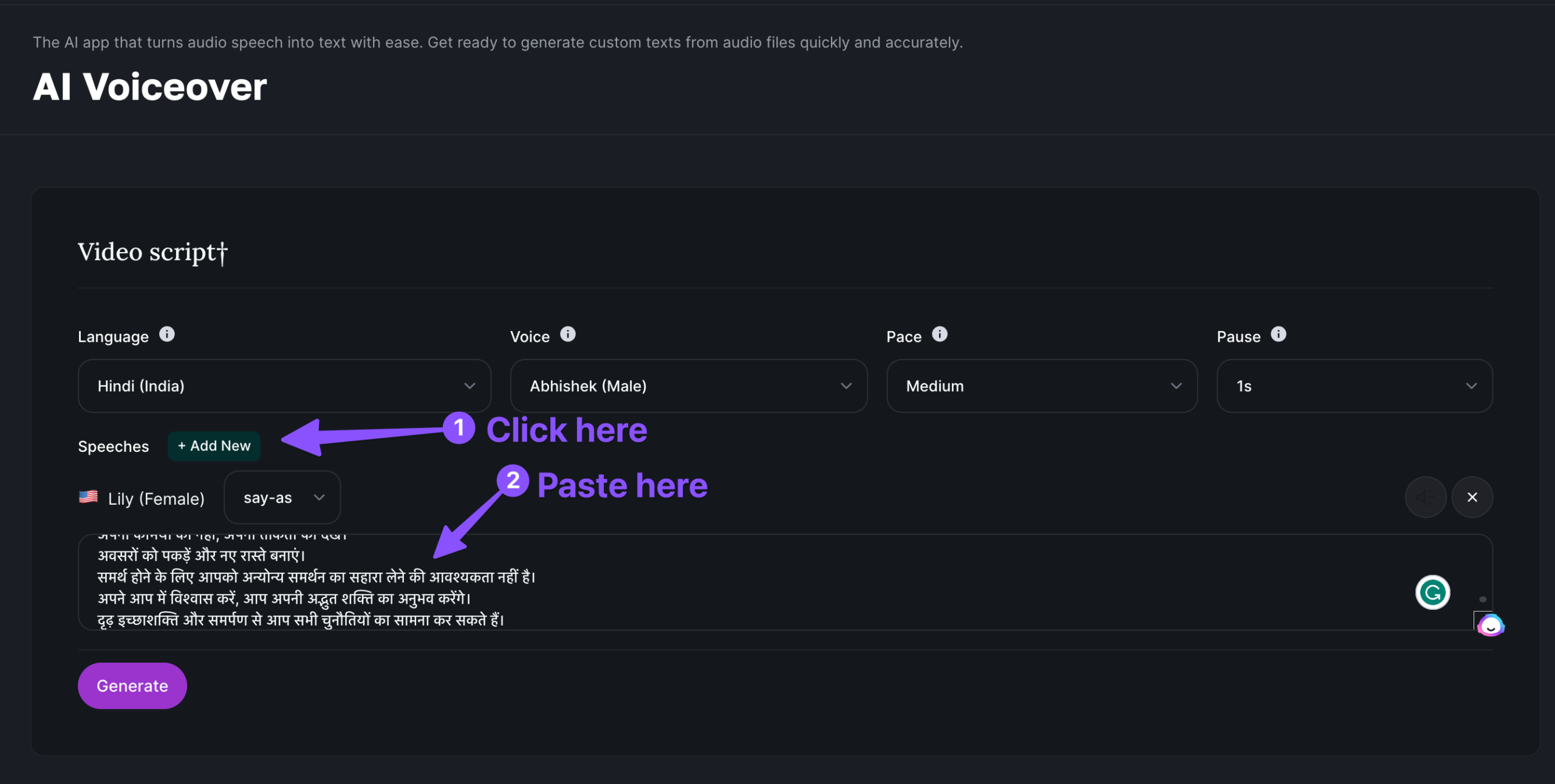 Now it’s time to add your video script, to do the same click on the “Add new” button in the speeches section as below;