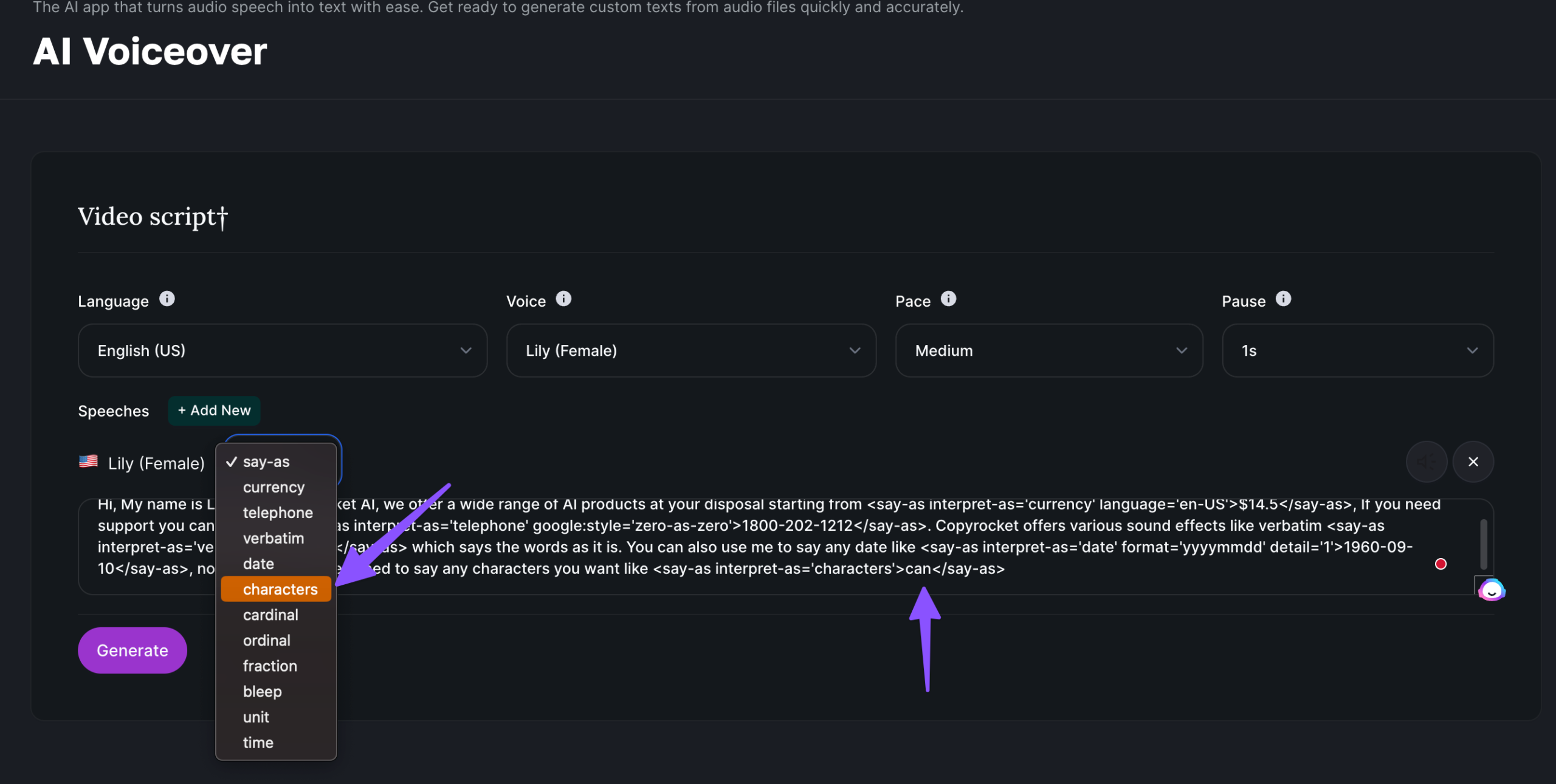 Likewise, if you want AI Voice to speak any specific characters from your script, you can easily do that with character sound effects as below;