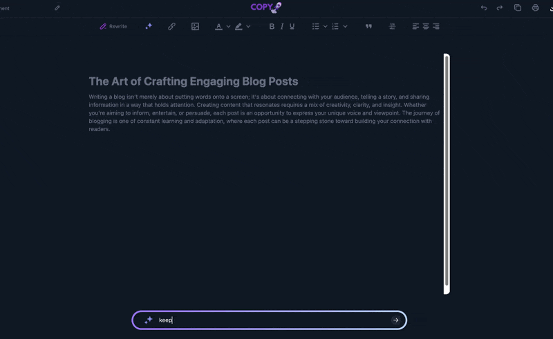Using Copyrocket AI feels like having a supportive writing companion that’s always ready to enhance your creative output, bringing inspiration and efficiency to your everyday writing tasks.