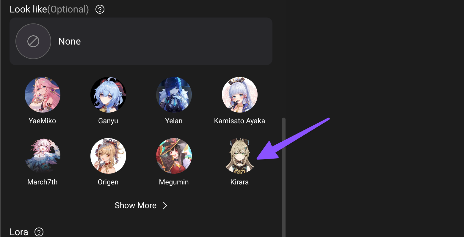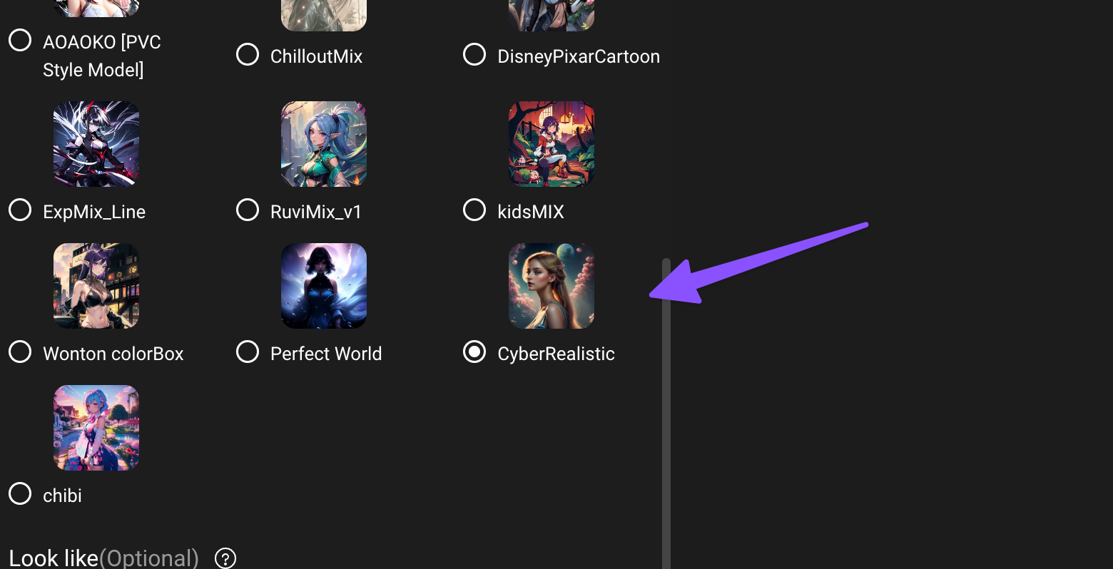 Next, You have the option to choose “Look like” which is optional, it’s for those who knew anime characters, they can choose any of them for the references as below;