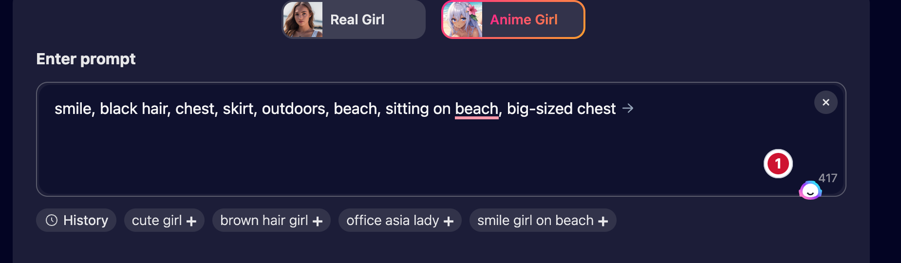 To start the hentai image generation process, you have to start typing your text prompt as usual, write as descriptive as you want or you can choose a customization filter to be as descriptive as you want to render high-quality artwork;