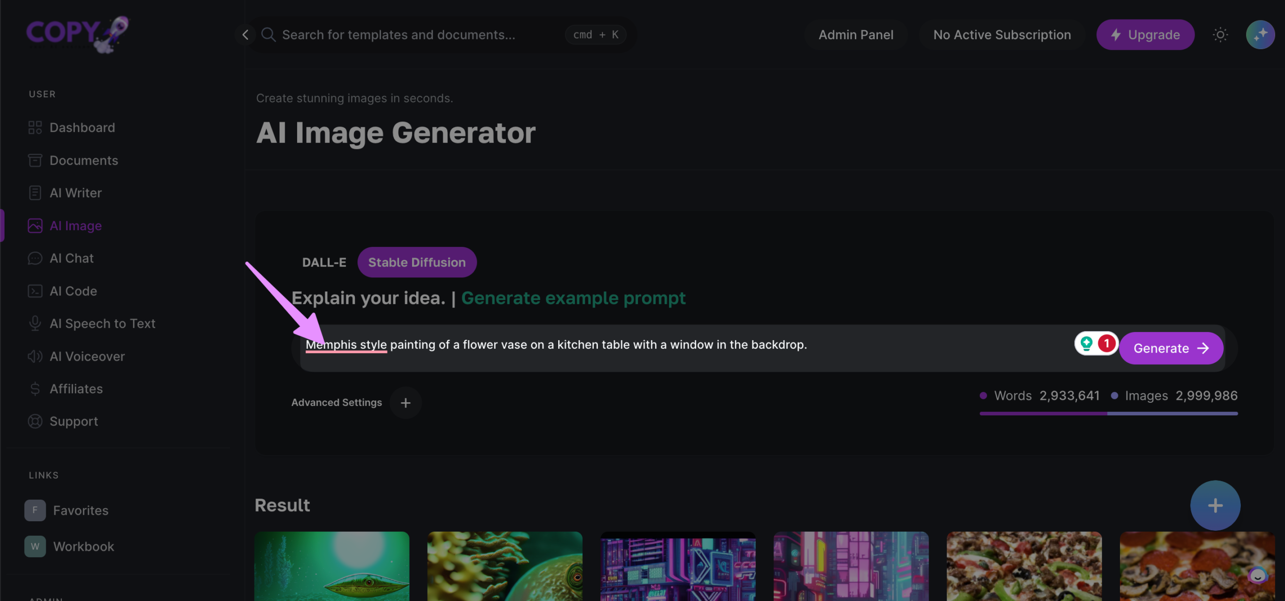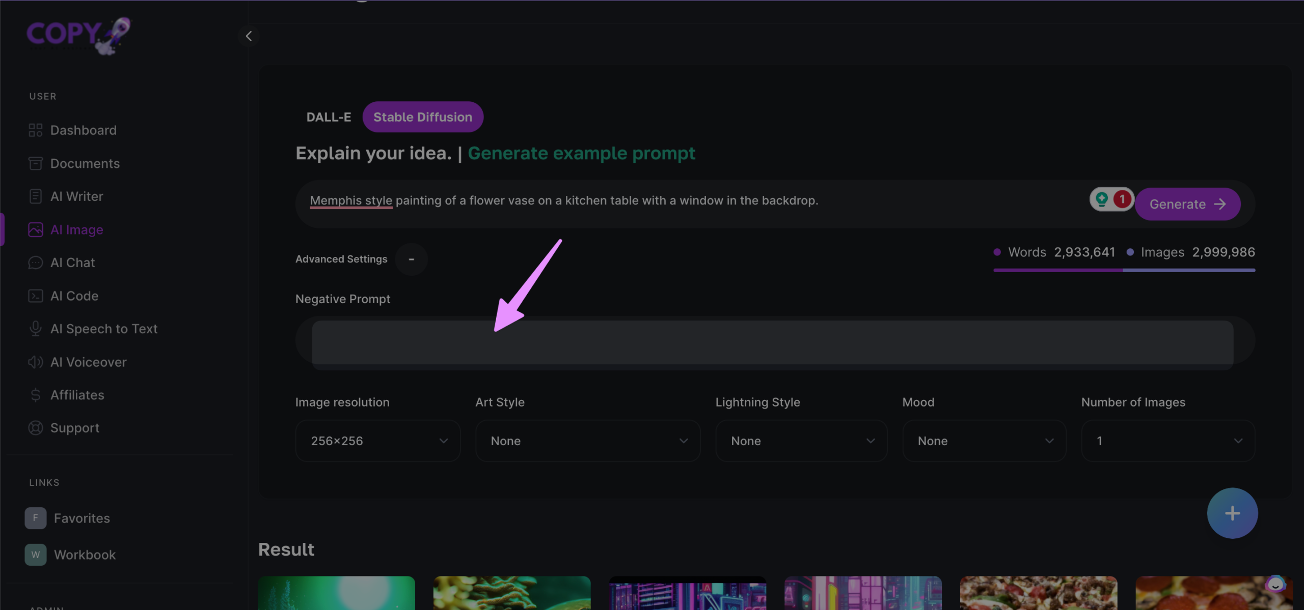 Copyrocket’s AI image generator offers integration of Two Models i.e. DALLE-2 and Stable diffusion. Therefore you have more option to choose and generate your images.