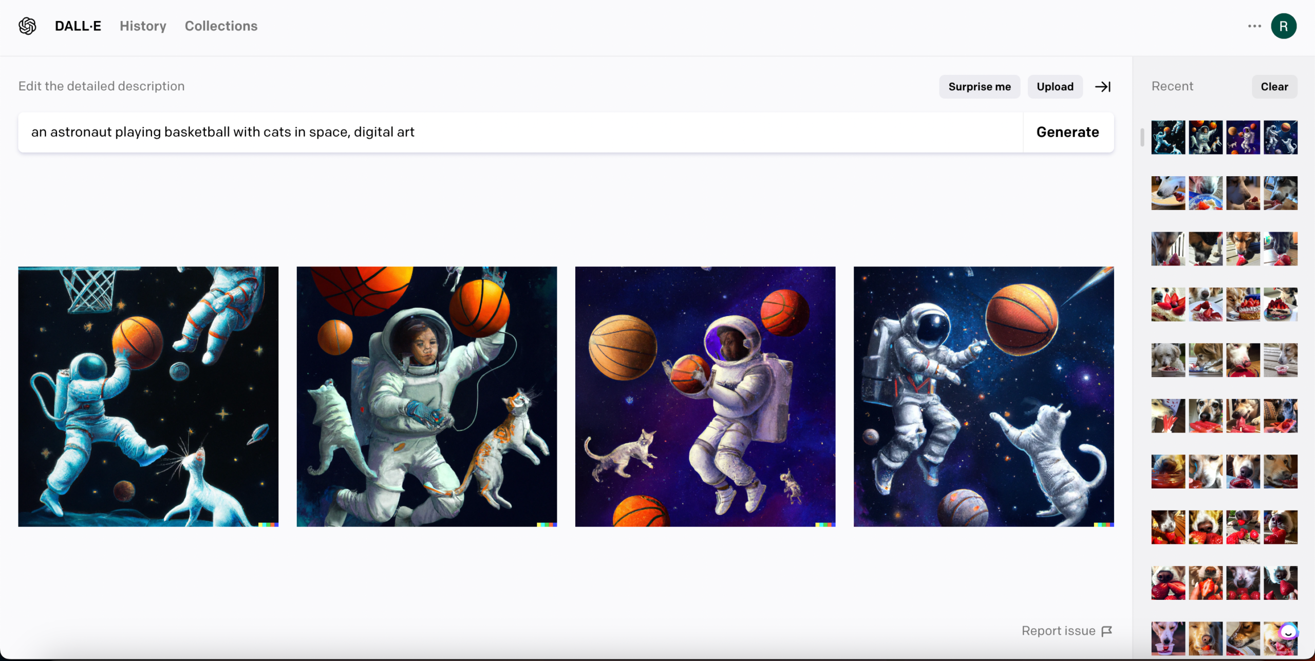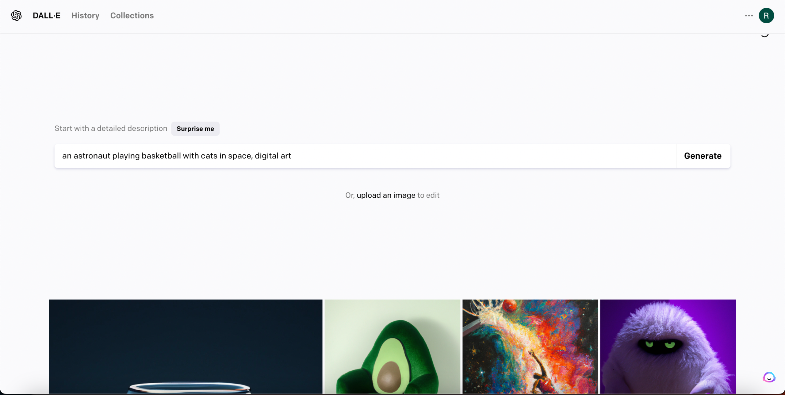 The process is very identical to the previous tools, first you need to have an account and go here to launch DALL-E 2 interface as below;