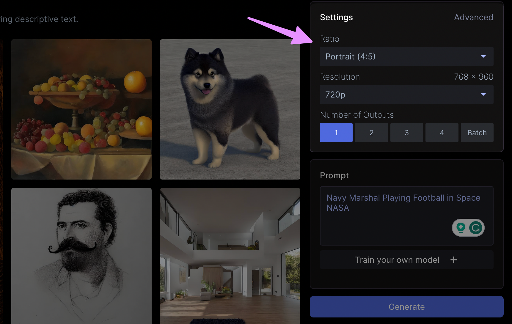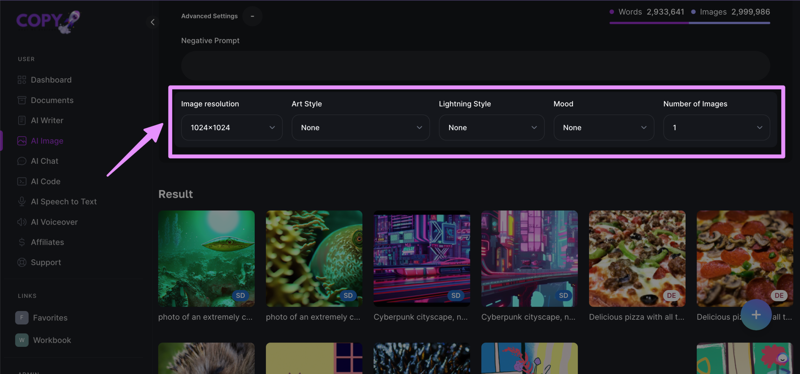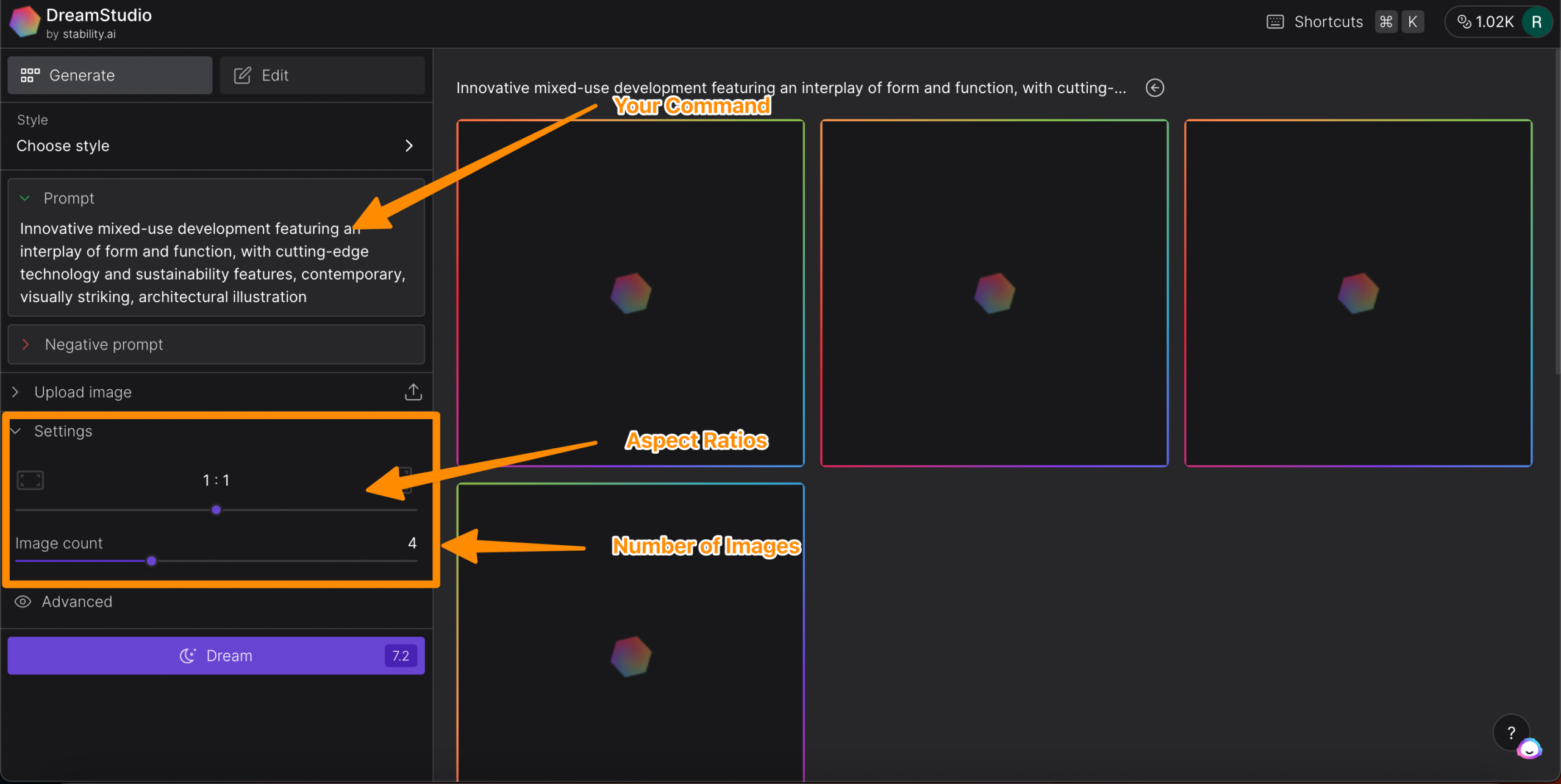 You can also select the aspect ratio, number of images and the quality of the image using the following options;
