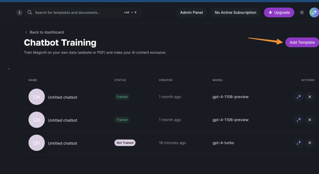 - Add a Template: Click the “add template” button. Creating a template is crucial as it sets up the framework necessary for importing the data your chatbot will learn from.