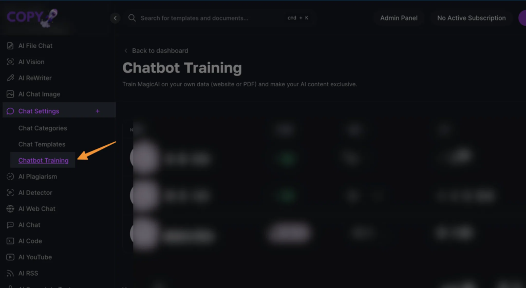 - Access Chatbot Training Settings: Once you’ve logged in, navigate to your dashboard, find “chat settings”, and click on “chatbot training”. This section is where you’ll begin crafting your personalized AI chatbot.
