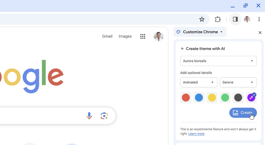 Click ‘Create’: Once you’re satisfied with your choices, hit the “Create” button. Google Chrome will then use your input to generate a series of AI-crafted themes.