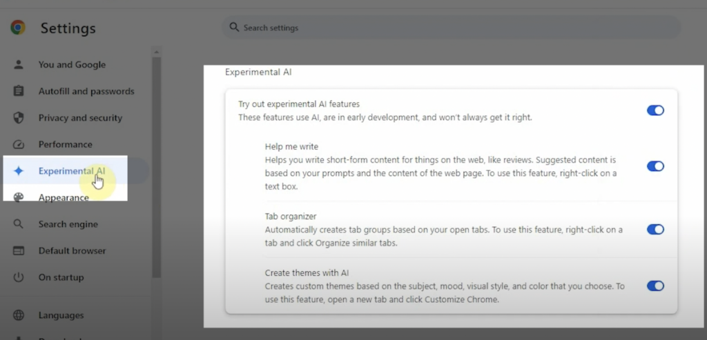 Enable AI Features: In the Experimental AI section, you will find various AI tools listed. Toggle each feature to the ‘On’ position to activate them.