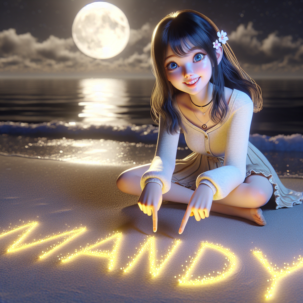 âBeautifull Korean girl, sitting on sand near the beach under full moon night and shooting stars, writing her name âMandyâ in bright, sparkling yellow light, use creative font, 3d style image, girl posing to camera pointing to her name written on sand with both hands, white skin tone, long black hair, blue eyes, hyper-realistic 8k octane render.â