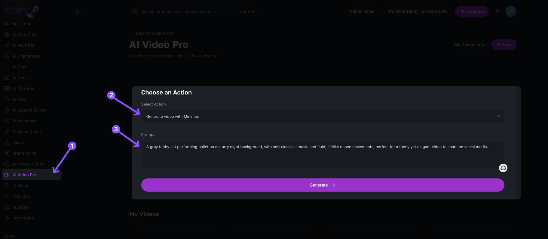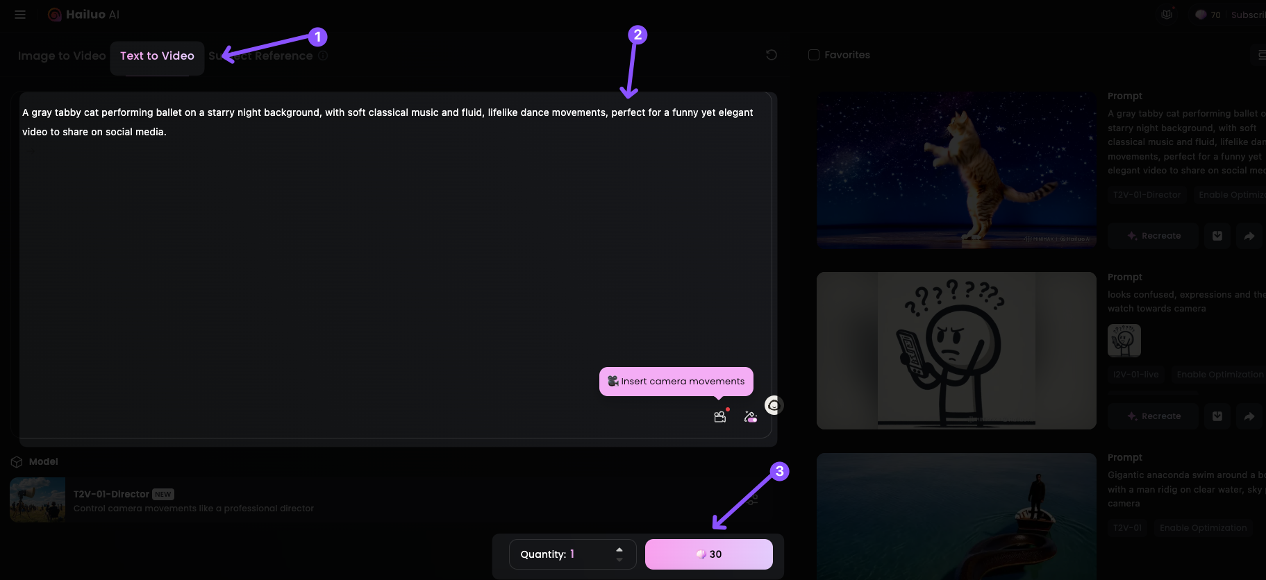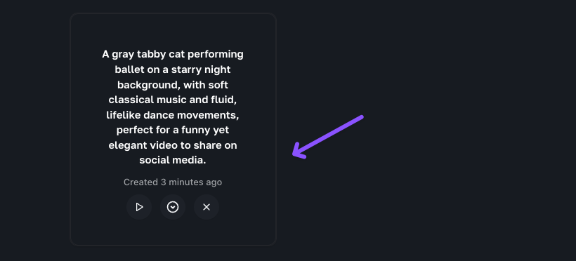 Enter the text prompt for your video concept. Whether it’s a funny dancing cat or a classical ballet animation, the possibilities are endless.