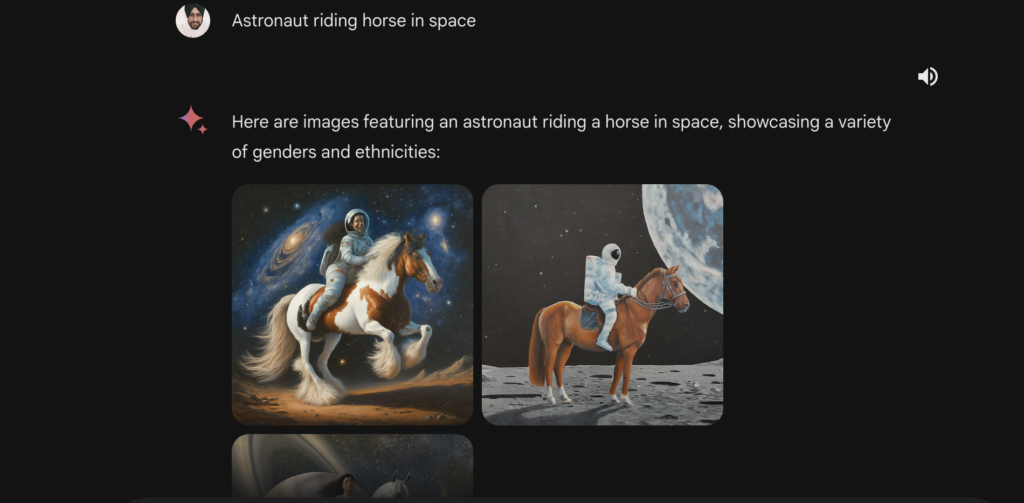 Let’s imagine something like “Astronaut riding a horse in space”. if we type this in the Gemini AI You will get the following output;