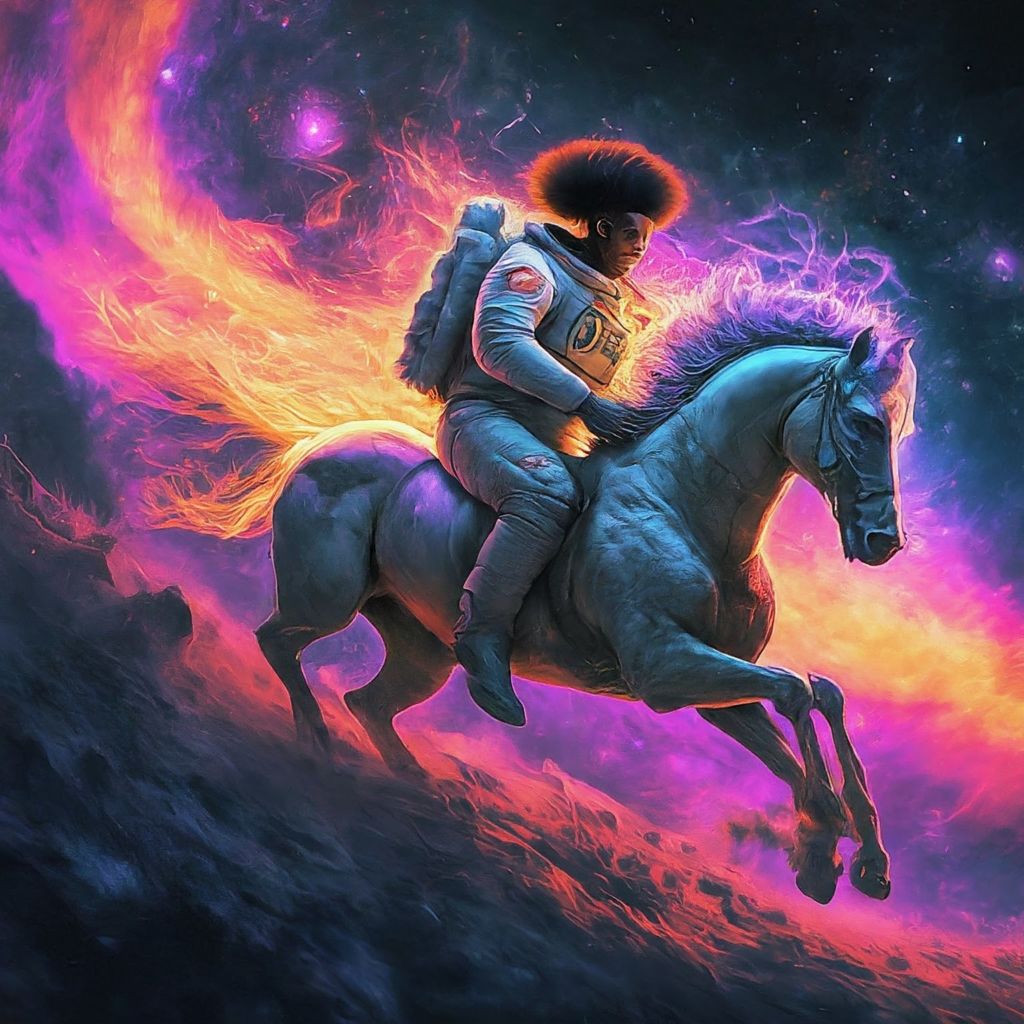 - Light Effects: Glowing effects around the astronaut, horse, and cosmic elements to create a surreal atmosphere.