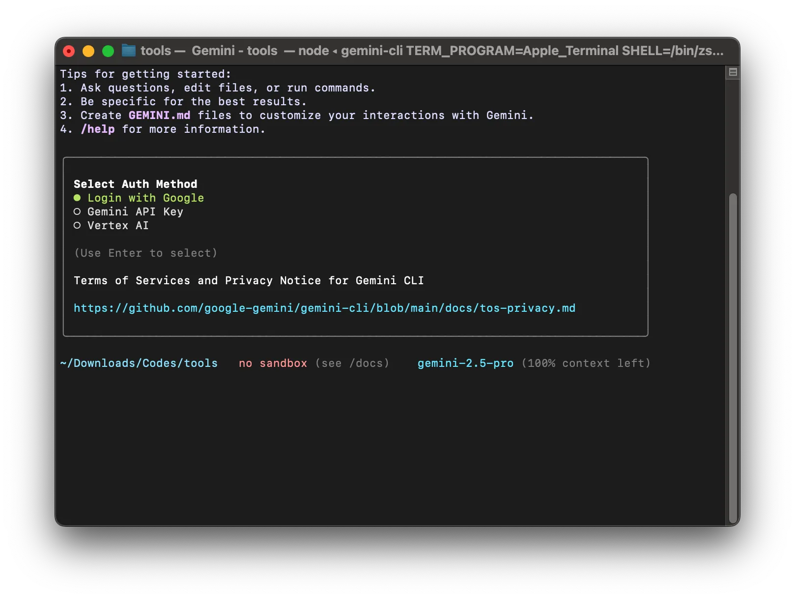 When prompted, log in using your personal Google account. This will give you access to up to 60 model requests per minute and 1,000 model requests per day.