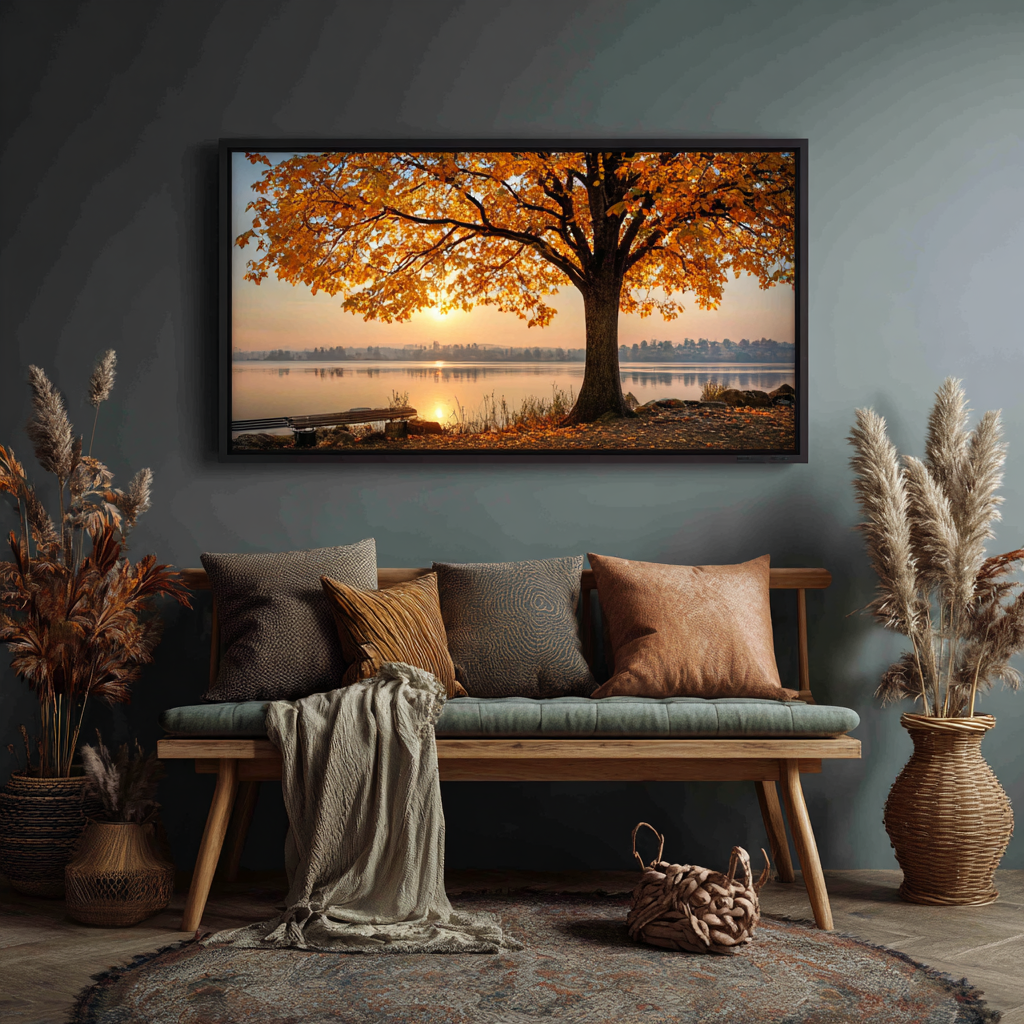 - Strong Prompt: "A tall oak tree with golden autumn leaves standing by a calm lake during sunset, in a hyperrealistic style, framed in a wide-angle shot on living room."
