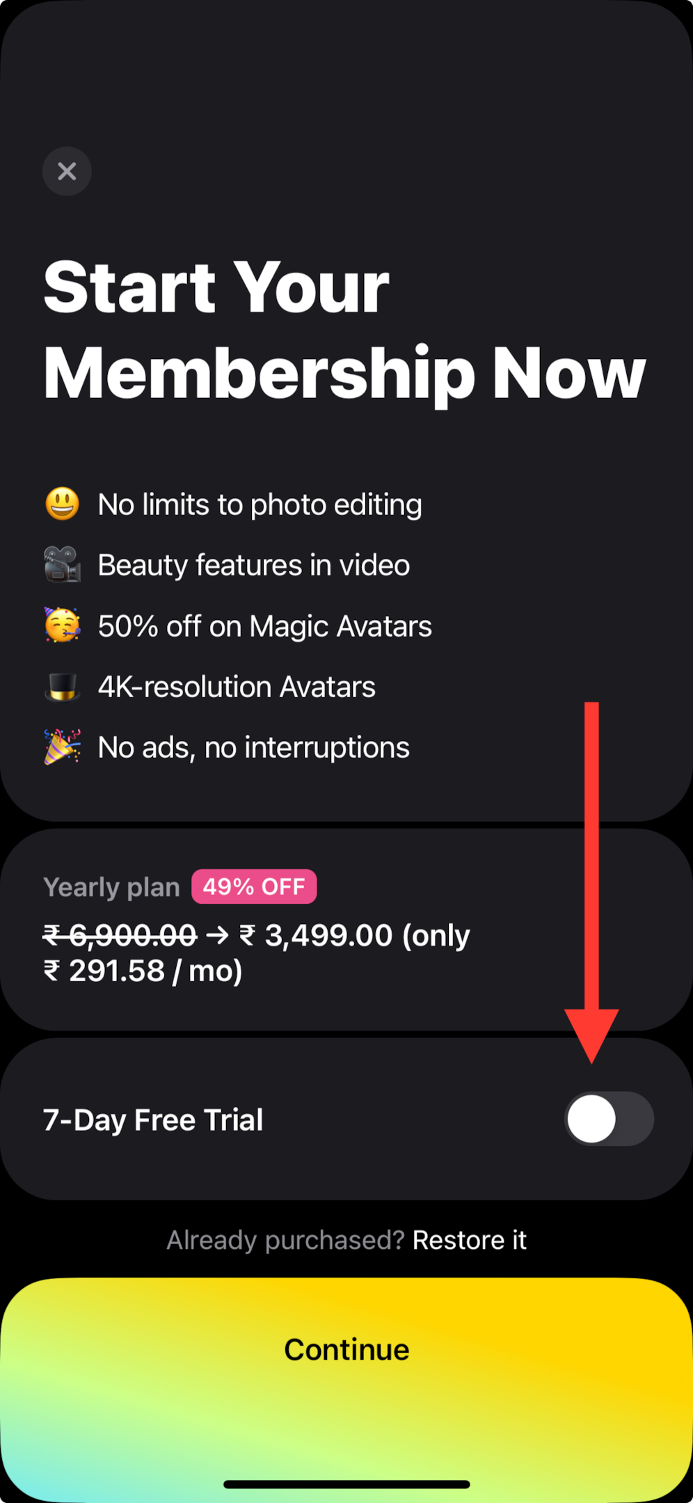 Tap the toggle next to “7-Day Free Trial” to switch it on