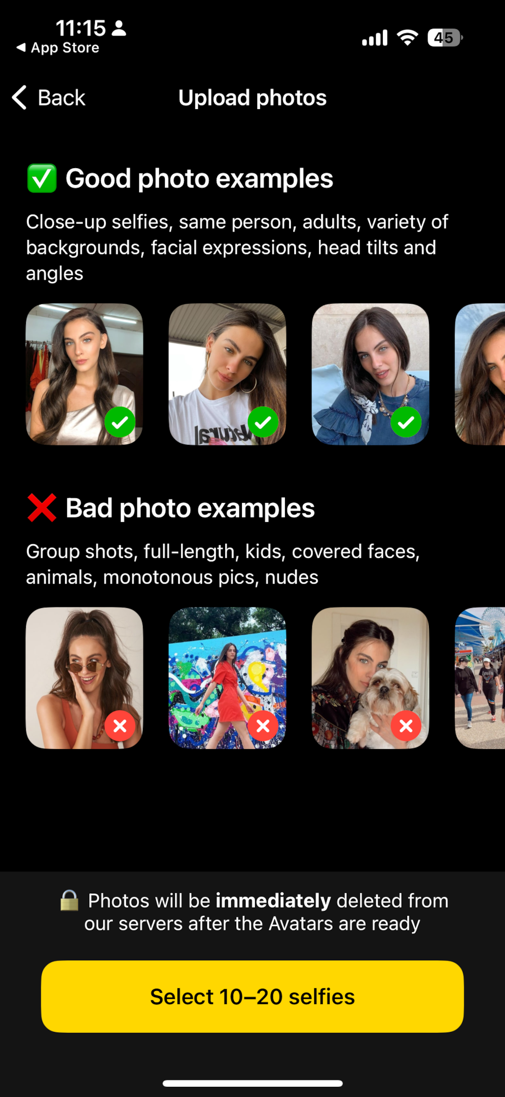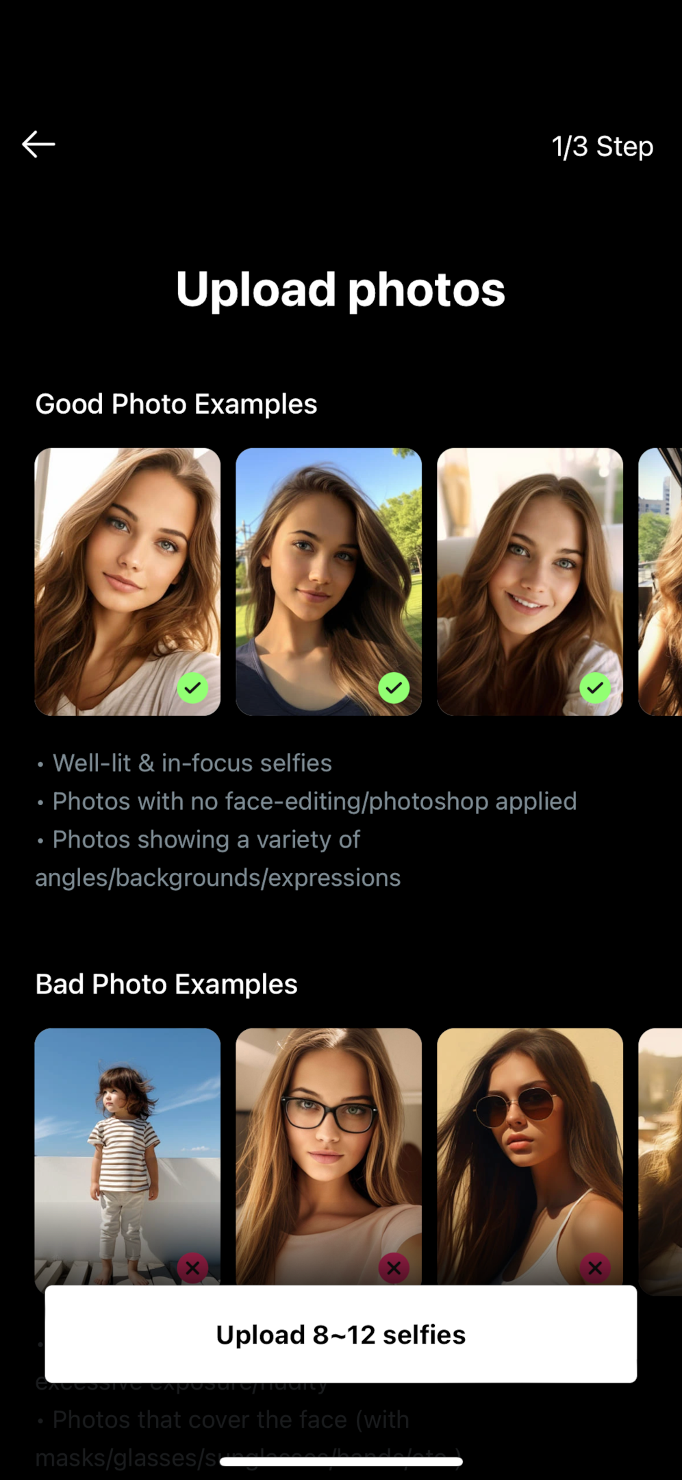 Upload 8-12 selfies and select your gender.