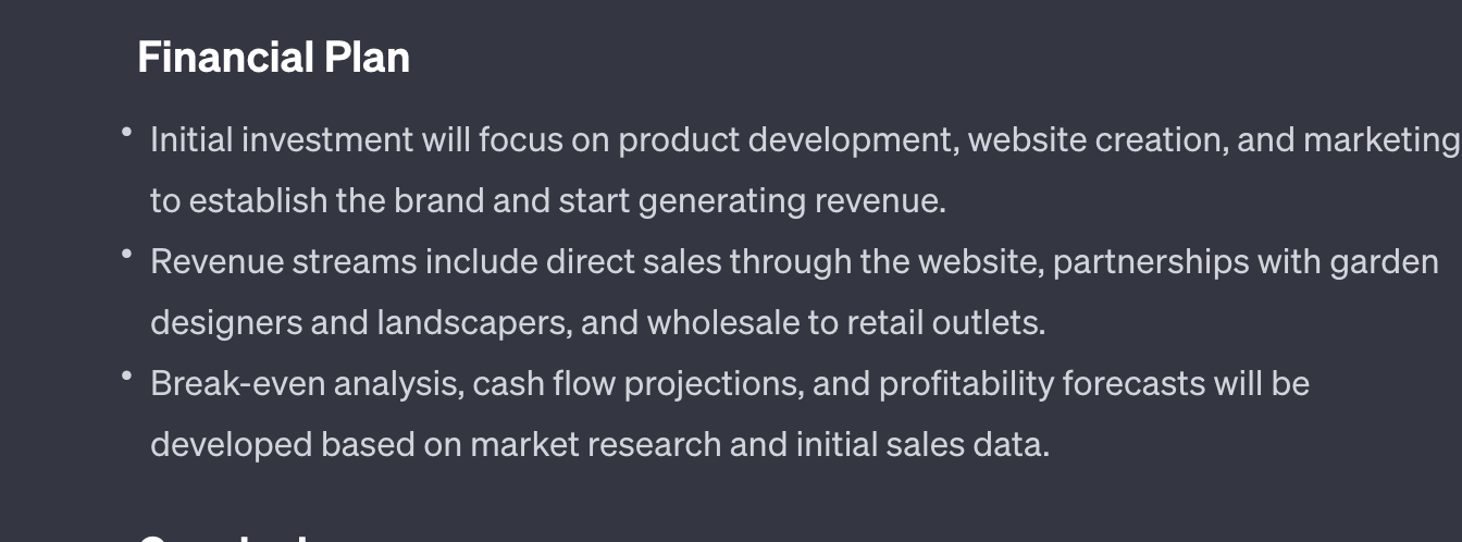 Ensure to enhance the outputs from ChatGPT by incorporating your research. This will add depth and precision to every aspect of your business plan, ranging from financial projections to operational details.