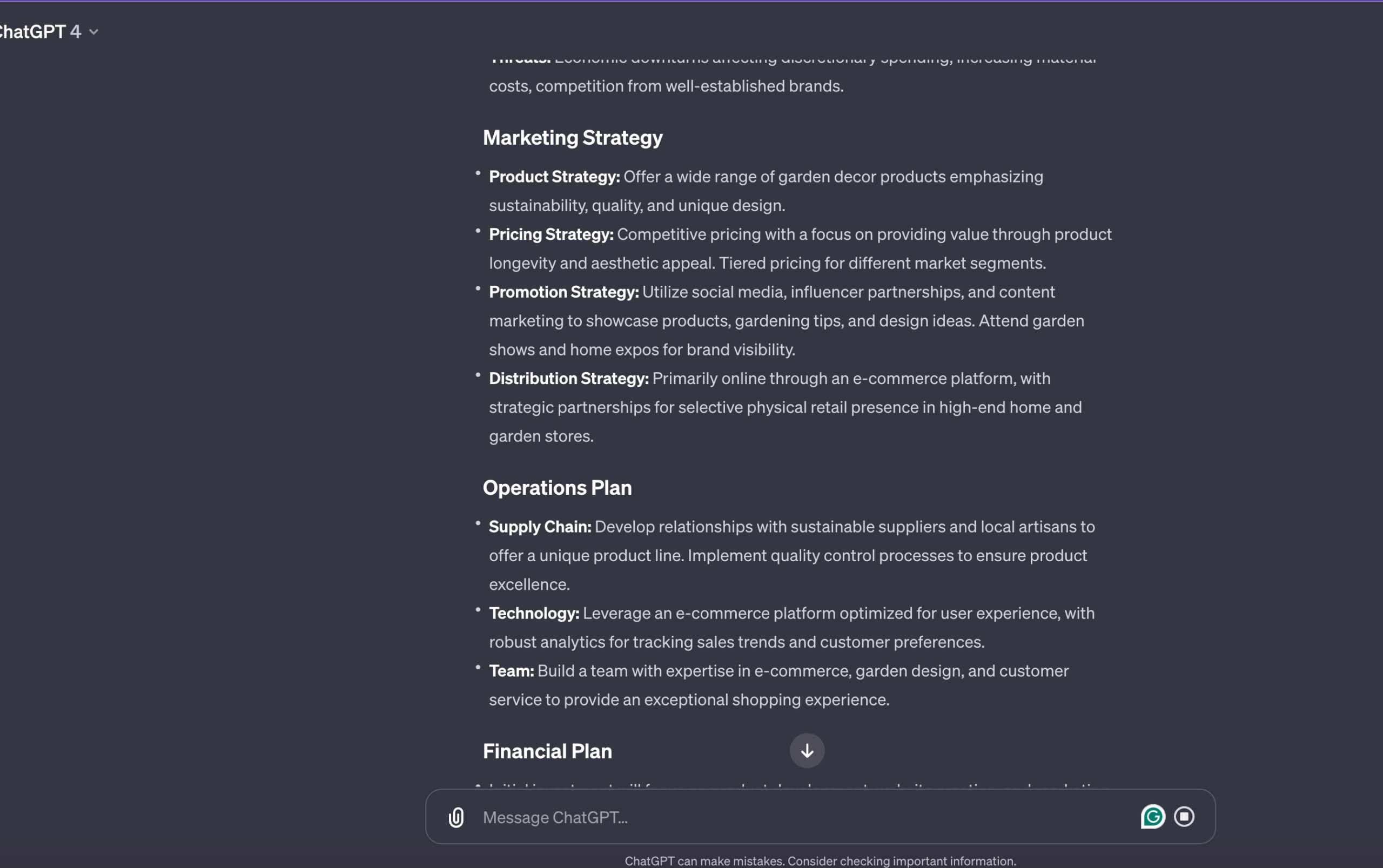Following these detailed, AI-powered steps, you’re well-equipped to forge a business plan that is not only thorough but aligned with current industry standards. Remember, while ChatGPT provides a great starting point for your business planning, augmenting AI suggestions with your insights and in-depth research is key to a tailored and persuasive business strategy.