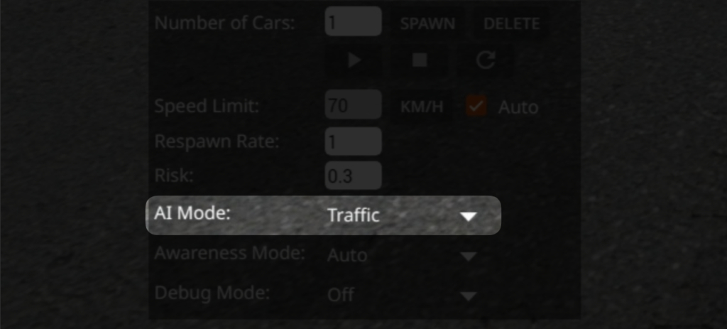 | Manual | Currently not usable from the App. Allows the AI to drive to a determined position. | At least one vehicle |
