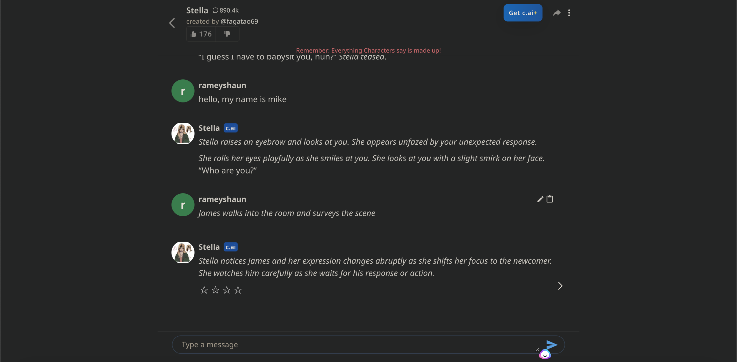For example, typing James walks into the room and surveys the scene will have your AI character, James, perform that action.