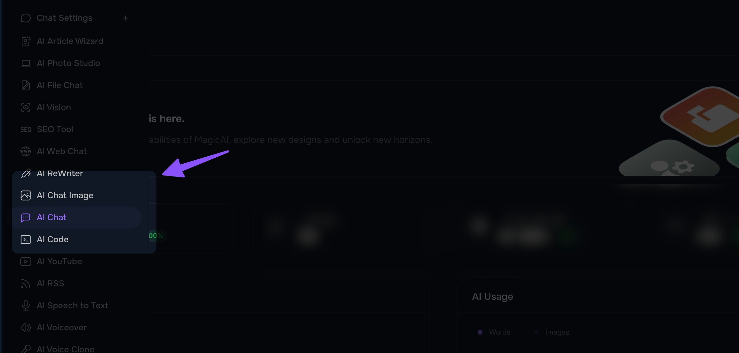 Select the AI Chat option, and then choose the Default Chatbox to begin.