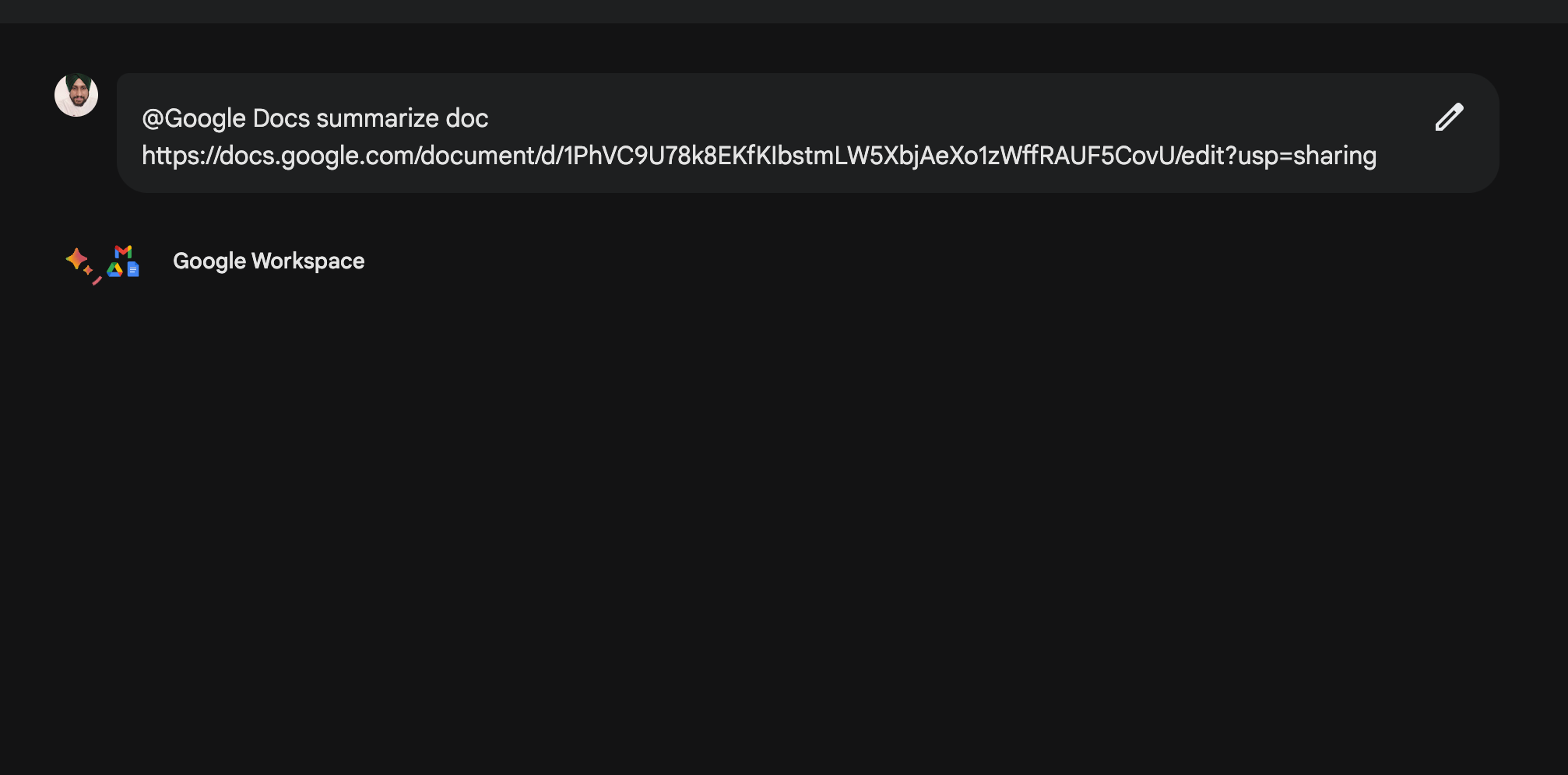 Select the docs and now paste your your Docs URL and enter your prompt, for example, Summarize this doc for me;