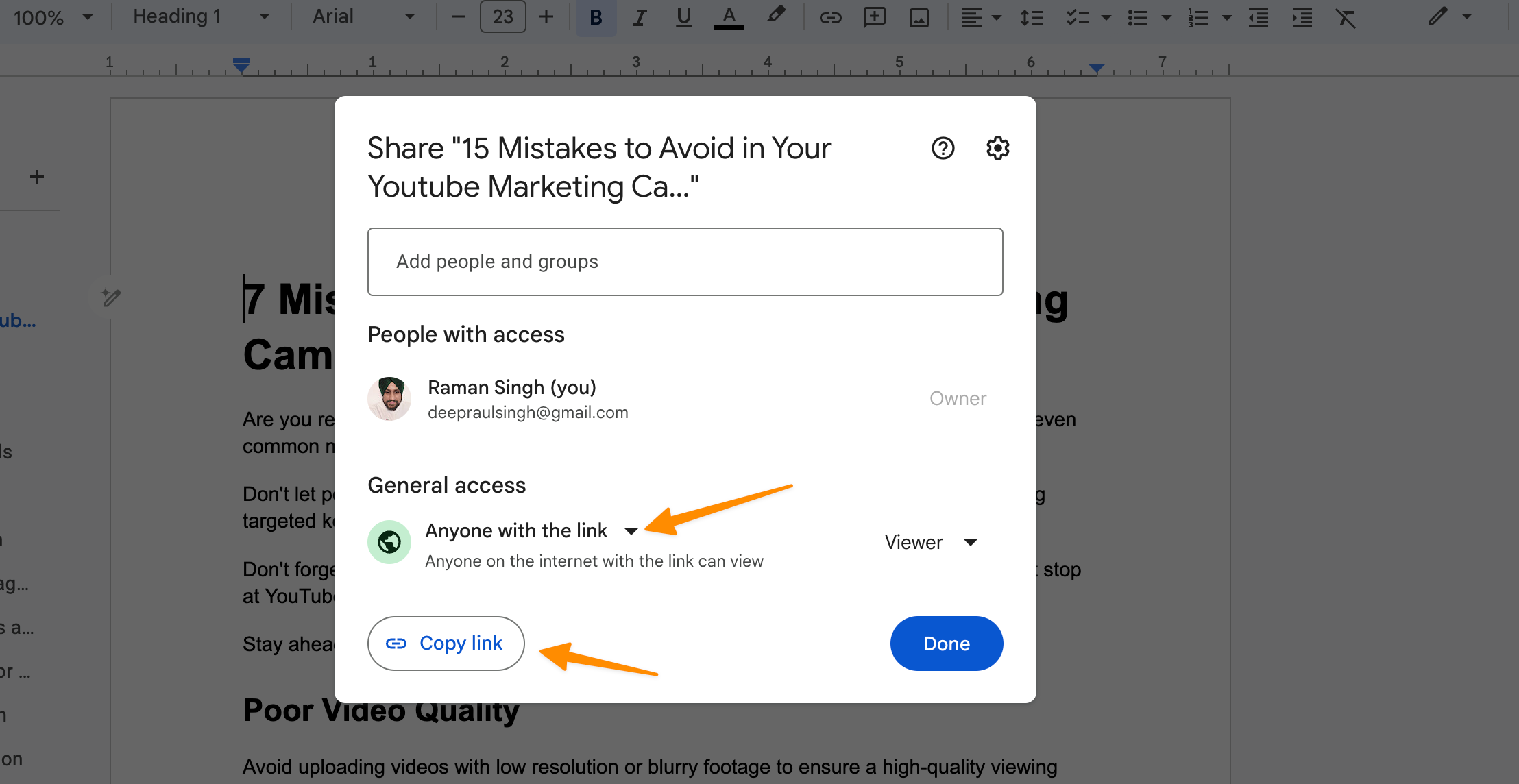 Click on share button on your Google docs page;