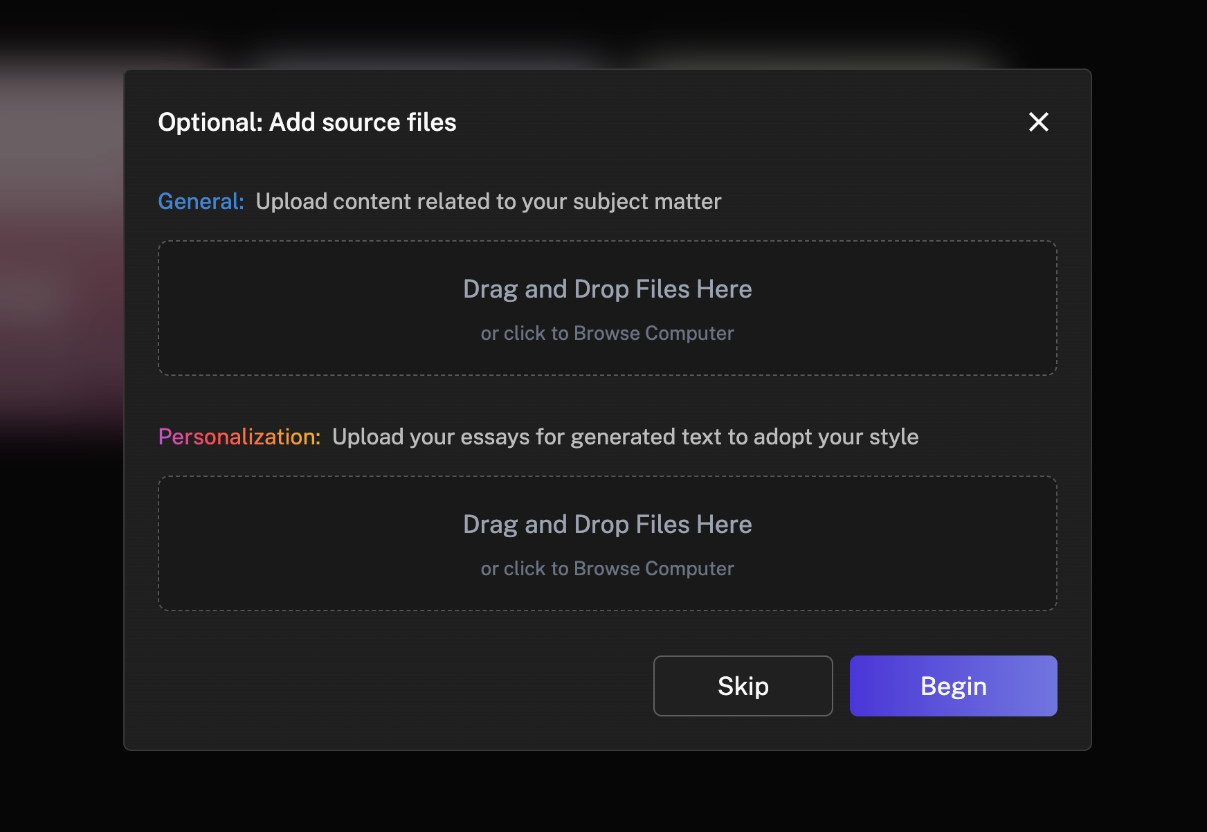 Next, you can add the source file for your Essay, for example, if you have an e-book available, upload the document here and also you have an option to upload your own written essay to match the writing style which helps Conch AI for natural language processing;