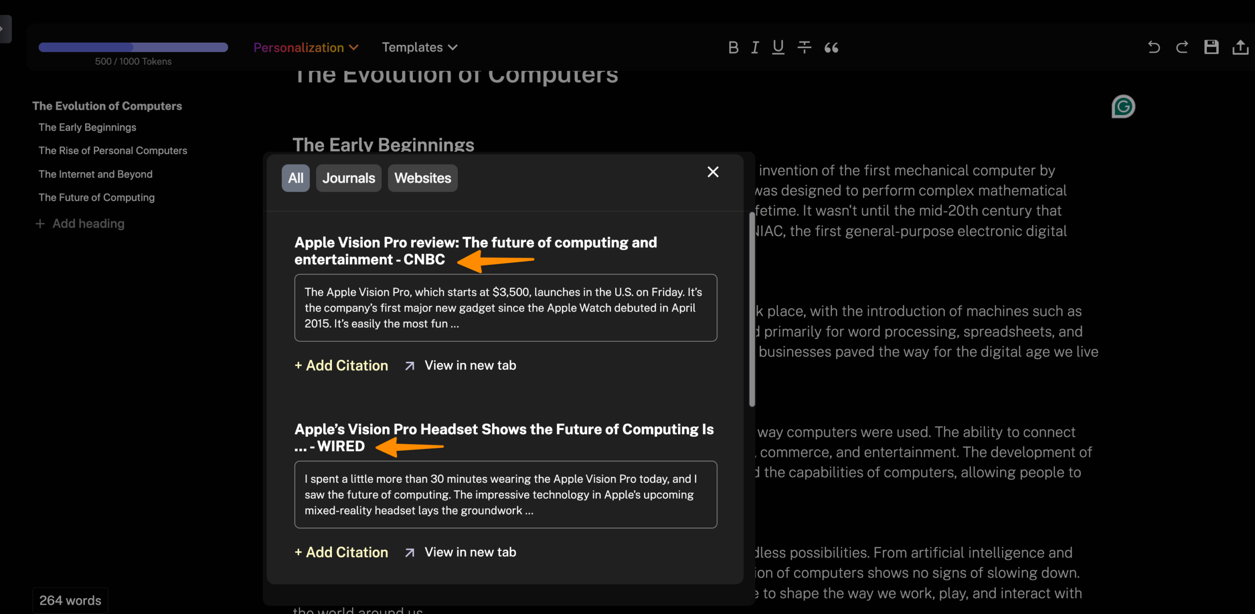 Now, Conch AI will take the piece of content, do data analysis in a search engine and search for reputed sources to add citations to your content like below;