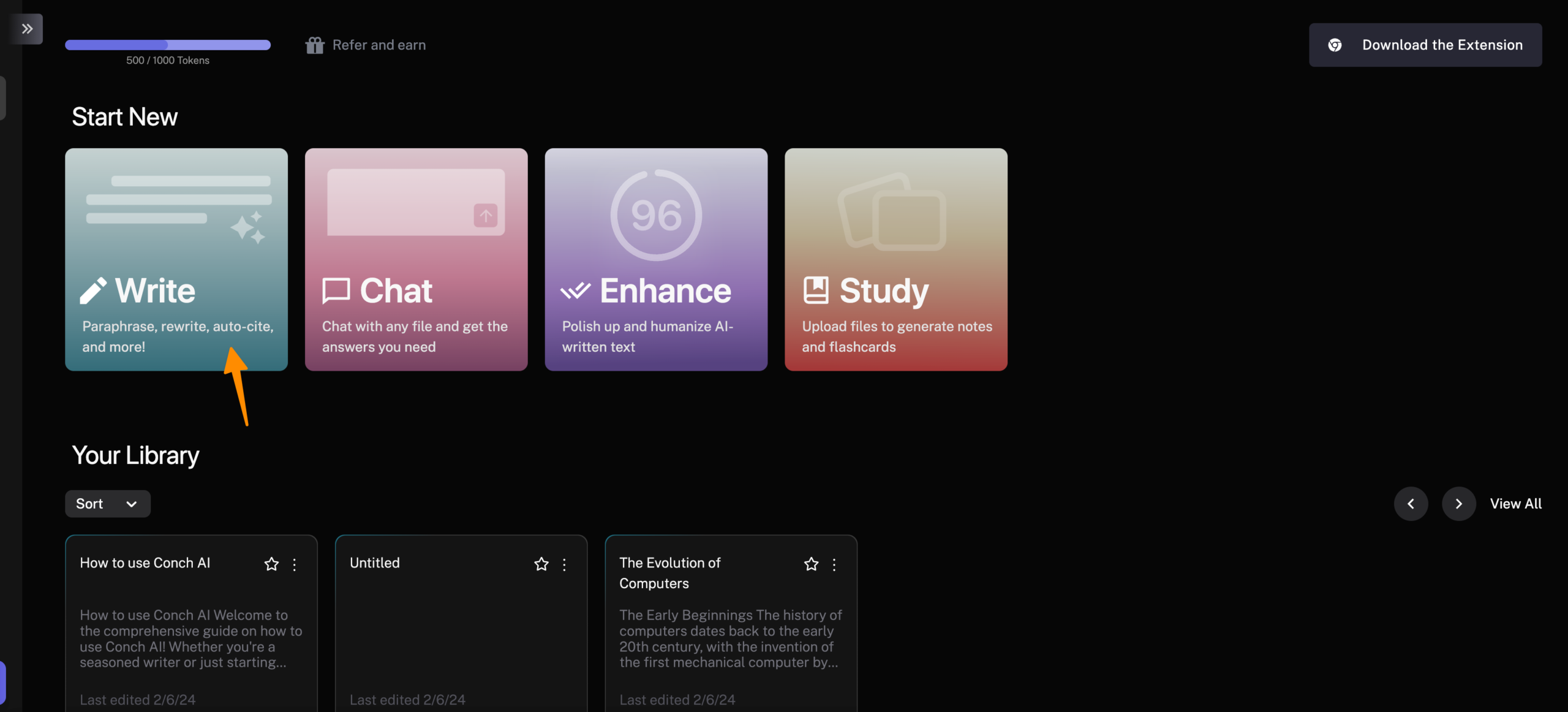 You can use Conch AI for Essay writing in a breeze, Signup for an account here and once you log in click on “Write” from the AI tool dashboard;