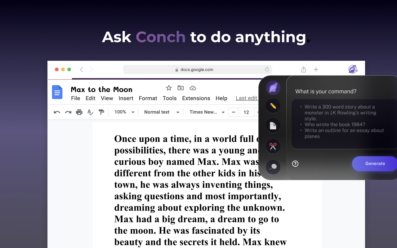 One of the standout features of the Conch AI Chrome extension is its question-answering capability. Powered by AI, Conch can provide instant answers to your queries without the need for context switching. Simply ask your question, and Conch will deliver the information you need, saving you time and keeping your writing flow uninterrupted.