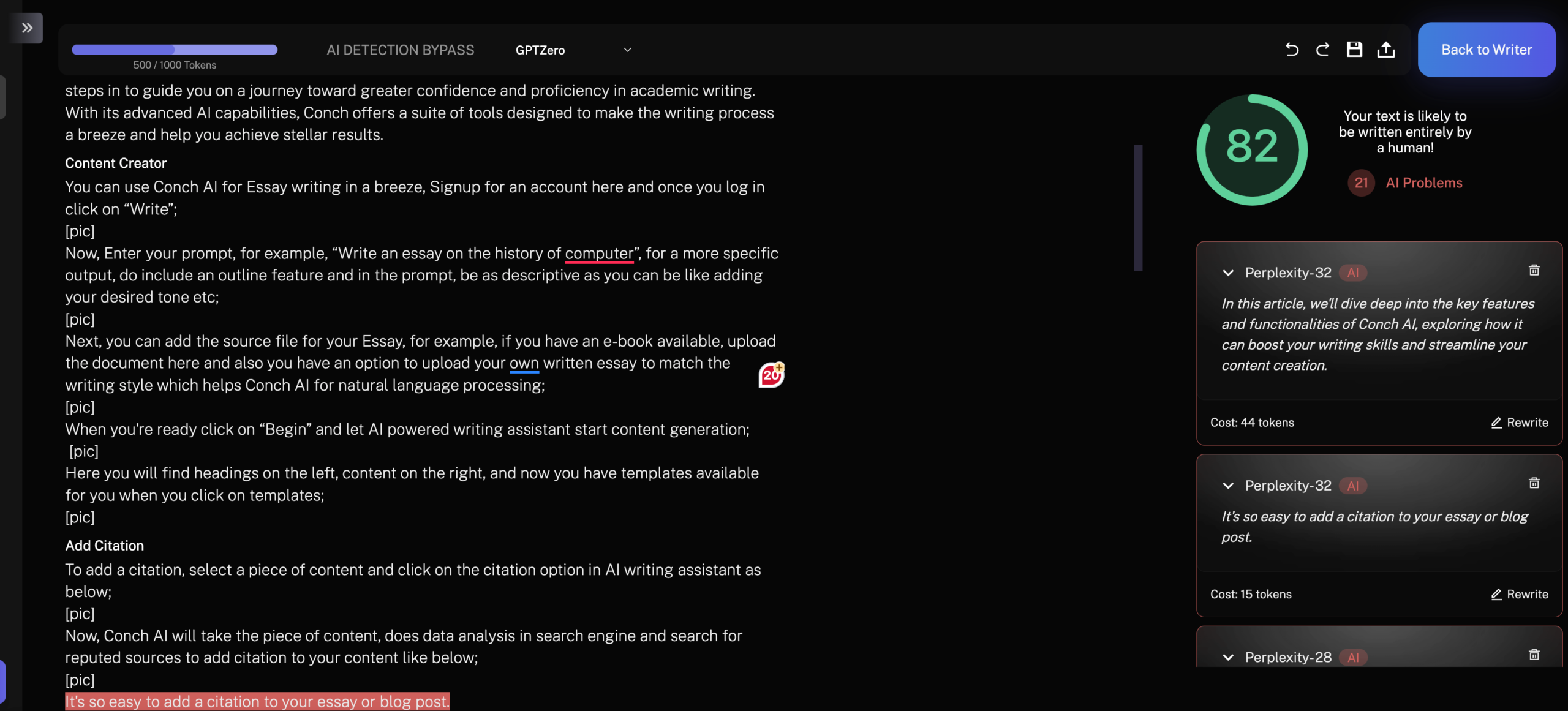 Gone are the days of spending hours editing and double-checking your work to ensure it doesn’t sound robotic or artificial. Conch AI takes care of that for you, instantly detecting any traces of AI-generated language and offering suggestions to make your writing more natural. By using this tool, you can save valuable time and ensure that your content reads like it was created by a human.